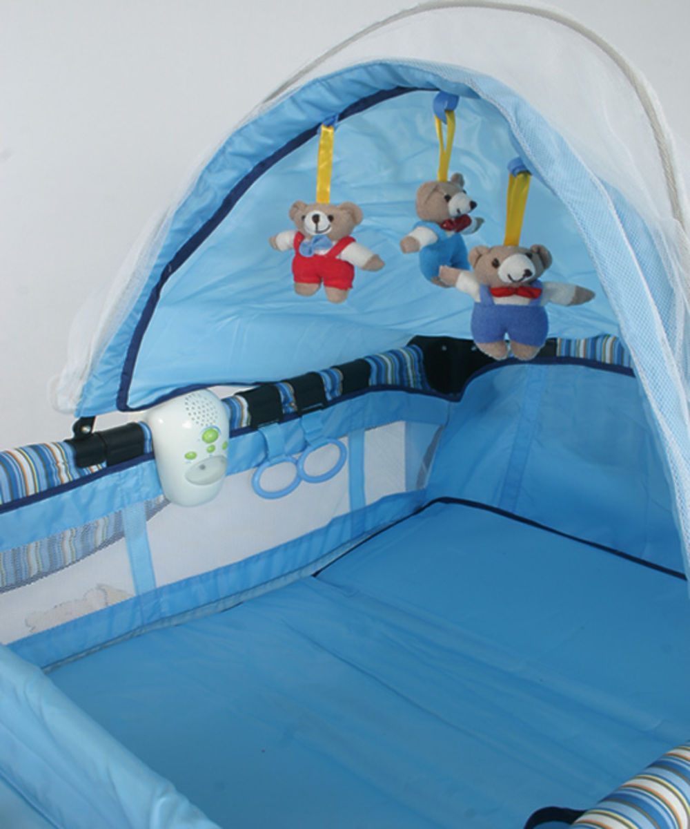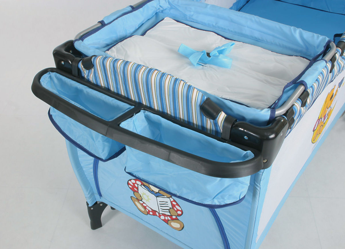 Cestovní postýlka má navíc stříšku s hračkami, čímž zaujme dětskou pozornost. Moskytiéra brání děti před hmyzem, velká boční kapsa je skvělá na doplňky a drobnosti. Boční část se otevírá, děti mohou pohodlněji z postýlky vylézat.