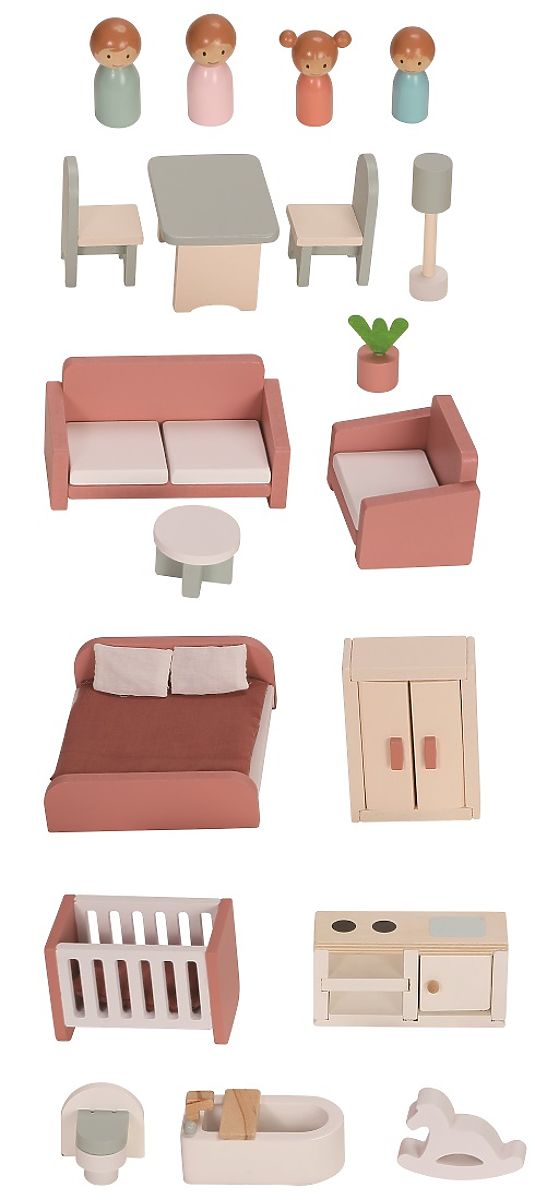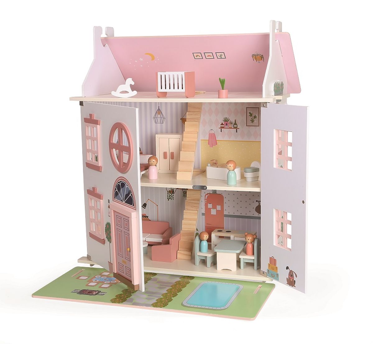 Dobrodošli u kućicu! Na mjestu gdje priče čekaju samo na vas. Zahvaljujući trima katovima i prostranim sobama, savršena je za vaše male lutke. Zajedno s obitelji ovdje ćete pronaći sve što je potrebno za moderni dom – kuhinju, kupaonicu, spavaću sobu, dnevni boravak i dječju sobu u potkrovlju. Skinite prednji dio krova, okrenite ga i postavite ispred otvorene kućice i odmah imate vrt s bazenom i namještajem za lutke. Stvarajte obiteljske priče prema vlastitoj mašti! Tijekom igre djeca vježbaju komunikacijske vještine, produbljuju socijalne interakcije i koriste kreativnost. Glavne značajke: omiljena, tradicionalna i bezvremenska kućica inspirira na maštovitu igru, trenira koordinaciju i finu motoriku, uključuje dodatke i lutke.