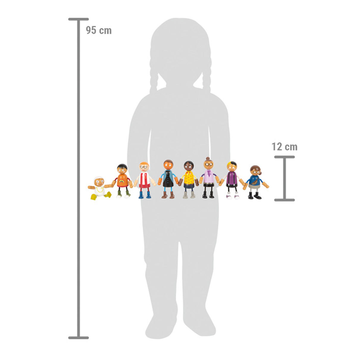 Ova velika obitelj drvenih savitljivih lutaka prikladna je za svaku kućicu za lutke. Sastoji se od 8 članova obitelji različitog spola i dobi. Savitljive lutke imaju glavu i tijelo izrađene od masivnog drva, dok su im ruke i noge tekstilne i savitljive. Dva para roditelja, troje djece i beba u nosiljci, koja se može pričvrstiti na ostale savitljive lutke, nude mnogo različitih mogućnosti igre. Aktivno igranje uloga poučava djecu na zabavan način koliko raznolik može biti životni stil. Igranje uloga potiče razvoj identifikacije, komunikacije, mašte te socijalnih i emocionalnih vještina. Savitljive lutke su svojom veličinom lako uhvatljive za male dječje ruke. Idealan dodatak gradskoj vili s kućicom za lutke (11802) i kompaktnoj gradskoj vili (12277). Glavne značajke: 8-člana fleksibilna obitelj lutaka potiče maštu, kreativnost i socijalne vještinerealistična zabava zahvaljujući savitljivim rukama i nogamafleksibilne, robusne s bogatim detaljimaveličina figurice lako je uhvatljiva za dječje ruke