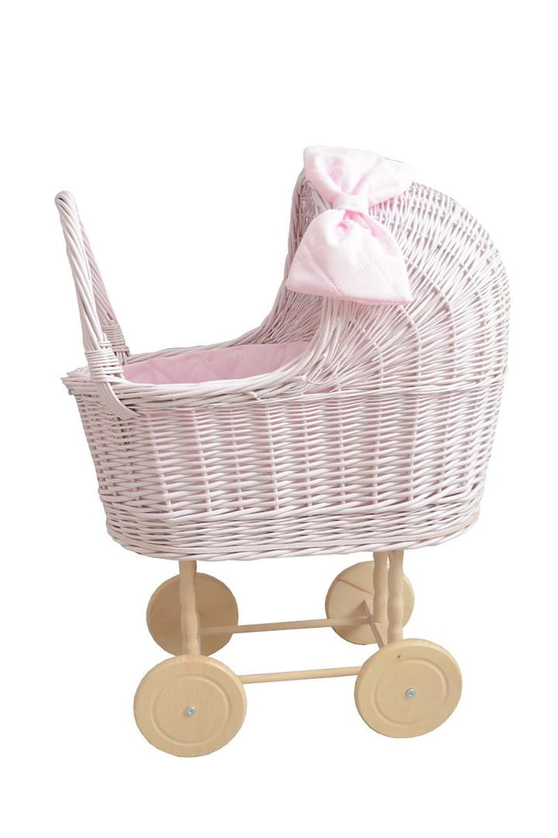 Slatka kolica za lutke u ružičastoj boji. Biti mala mama je ostvarenje sna svake djevojčice. Lijepa i praktična igračka koja ne može nedostajati ni u jednoj obiteljskoj igri. Jedinstvena kolica s prekrasnom ušivenom mašnom neće biti samo izvrsna igračka već i savršen dodatak sobi. Drveni kotači daju kolicima jedinstven retro izgled.
