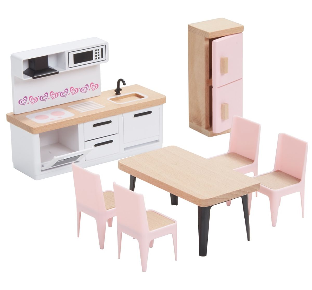 Izvrsni set drvenog namještaja koji vam omogućuje opremanje bilo koje kućice. 5 u 1, to su spavaća soba, kuhinja, dnevni boravak, dječja soba, kupaonica i cijela obitelj. Prekrasno detaljni drveni komadi pomoći će mladim maštama da iznova i iznova stvaraju očaravajuće interijerske scene. Sastoji se od 36 dijelova. Nijedna kućica za lutke nije potpuna bez ovog seta! Glavne značajke: sadrži 36 komada, prikladno kao kompletan set za prvu kućicu naših malih princeza, trenira komunikacijske vještine i koordinaciju, inspirira na kreativnu i maštovitu igru.