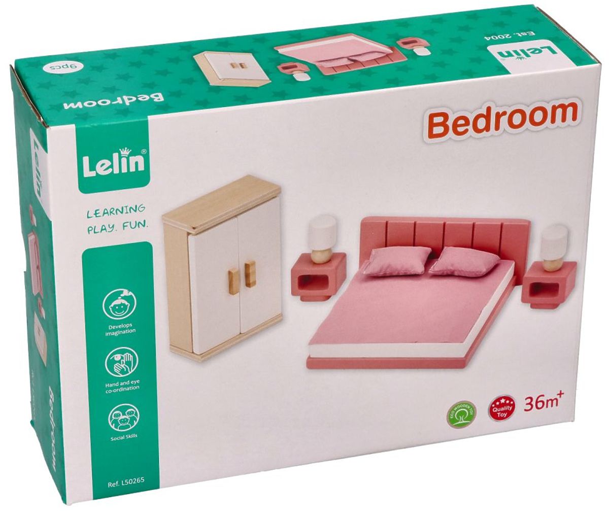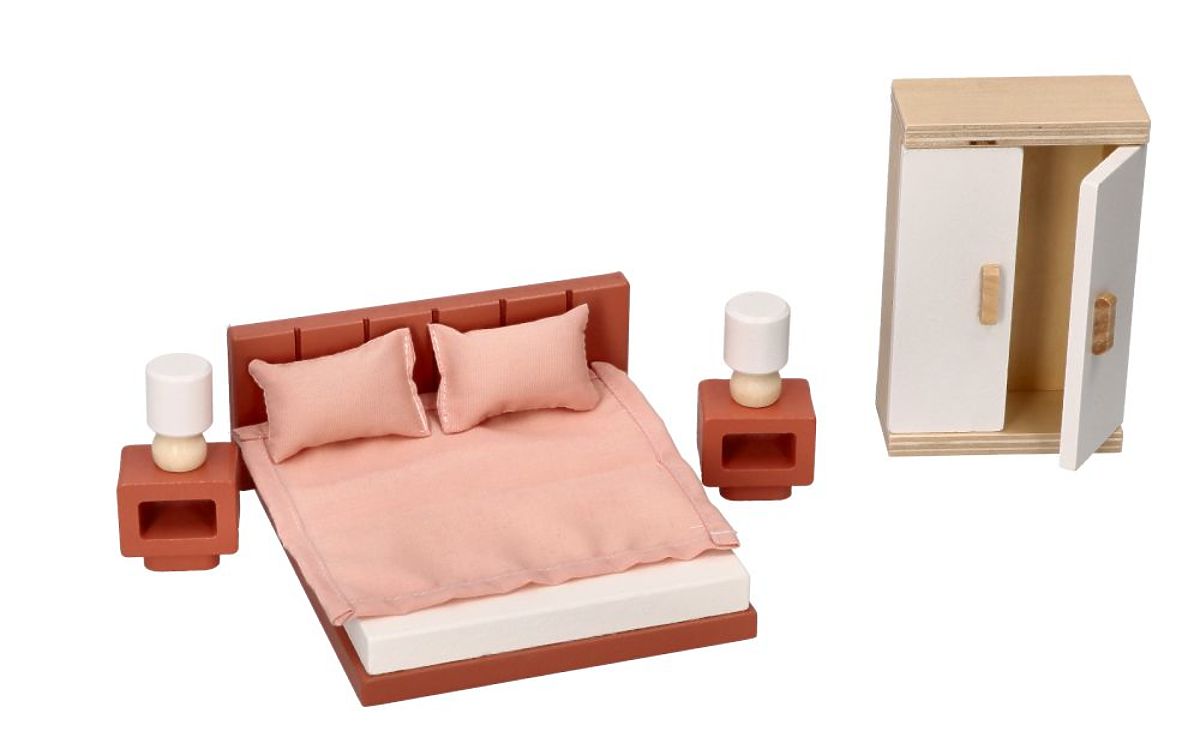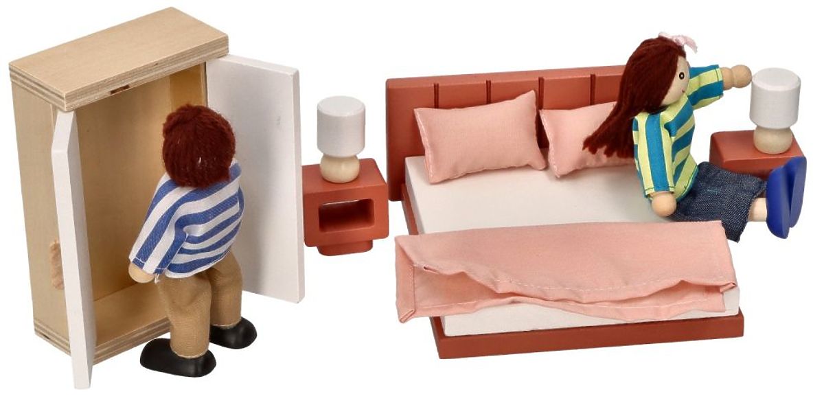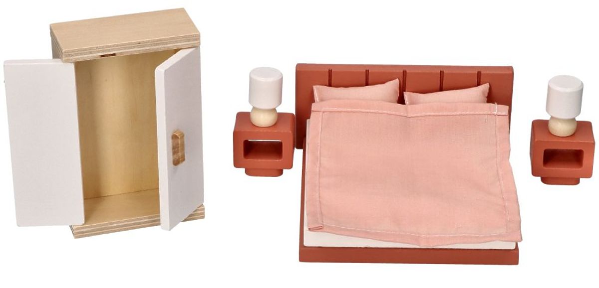 Ugodna drvena spavaća soba idealno je mjesto za odmor nakon dana punog zabave. Set je dizajniran za kućicu za lutke i sadrži sve potrebne elemente za stvaranje atmosferskog i udobnog interijera: udoban krevet s posteljinom, noćni ormarić, lampu i ormar za odjeću.