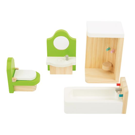 Ovaj 4-dijelni set kupaonske opreme je veličine za savijanje lutki do 12 cm. Izrađena je od punog drva za dugi vijek trajanja. Glavne značajke: tijekom igre ovaj set budi maštu i trenira finu motoriku