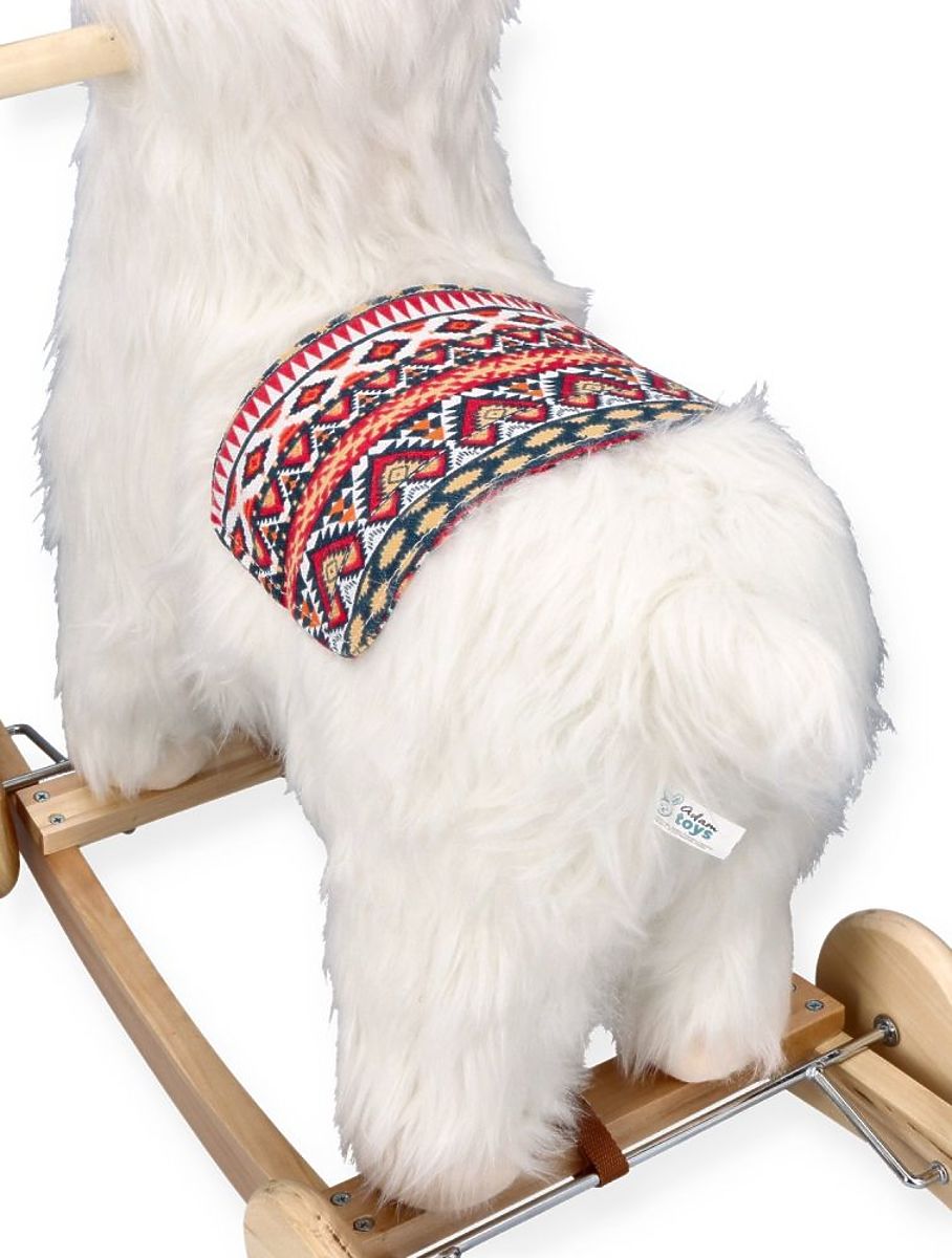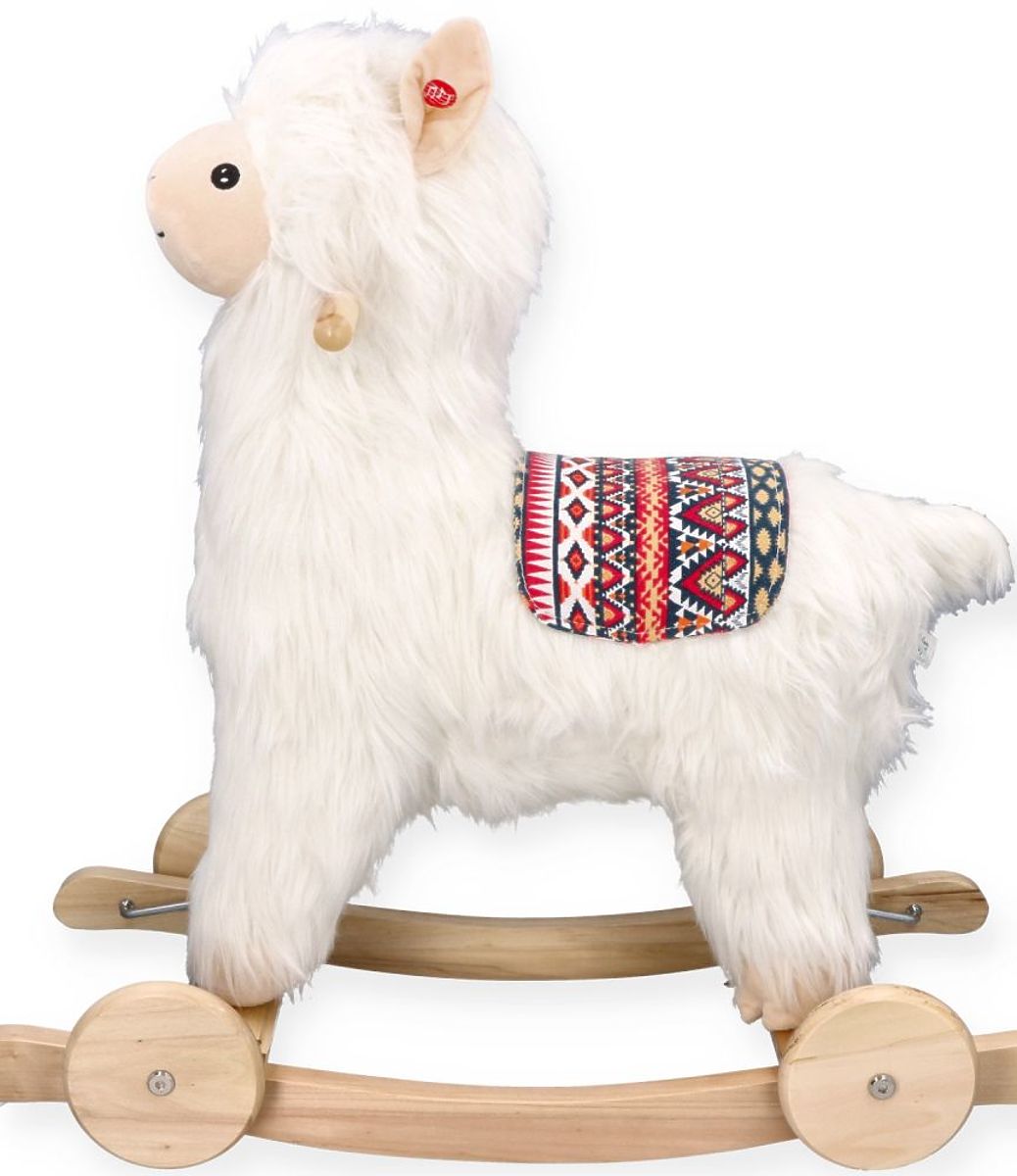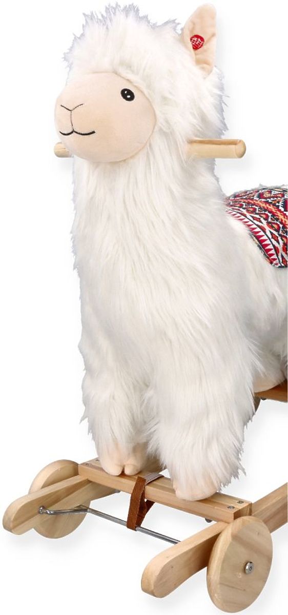 Ovaj novi jedinstveni dizajn čini našu alpaku izuzetnom među ostalim sličnim proizvodima. Alpaka je izrađena od iznimno mekog i lagano dlakavog materijala kako bi podsjećala na pravu alpaku. S veselim licem i šarenim sedlom s peruanskim uzorcima izgleda doista izvanredno. U jednom uhu nalazi se gumb koji pokreće melodiju. Osim toga, alpaka je opremljena kotačima, tako da se može koristiti na dva načina: za ljuljanje ili vožnju.