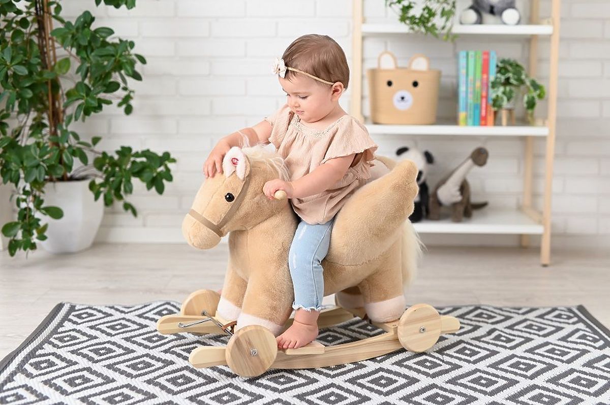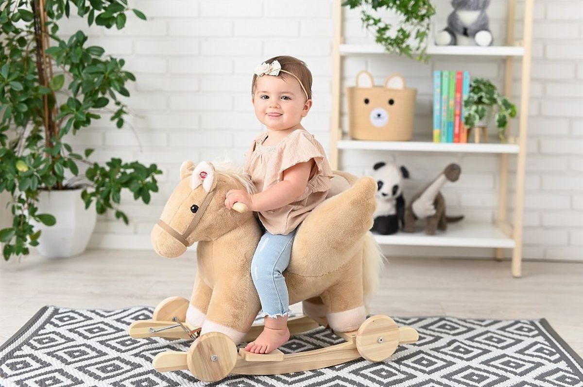 Pegaz je izrađen od mekog i nježnog na dodir plišanog materijala u nježnoj bež boji. Klizači i ručke su izrađeni od drva u prirodnoj boji, što se savršeno uklapa u cjelokupni koncept. Naš plišani prijatelj ima drvene kotače, što omogućuje da, ovisno o njihovom rasporedu, može biti ljuljačka ili guralica. Pretvorba iz guralice u ljuljačku je vrlo jednostavna. Nije potrebno ništa rastavljati, samo otkopčajte poseban remen i okrenite kotače na drugu stranu klizača. Gotovo!