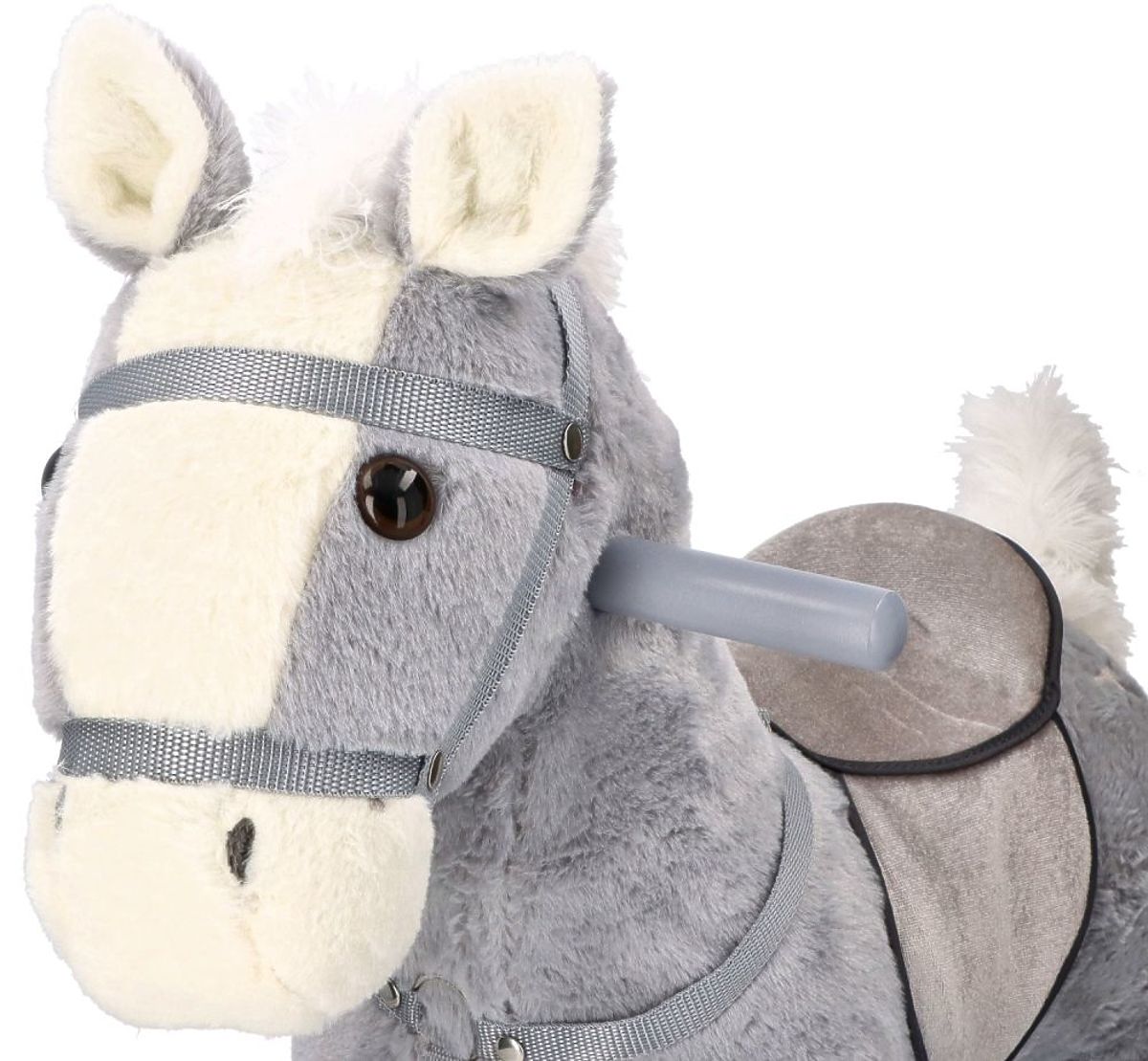 Ovaj prekrasni ljuljački konj ističe se modernim dizajnom i bojama. Konj je siv s bijelim dodacima kao što su njuška, rep i griva.