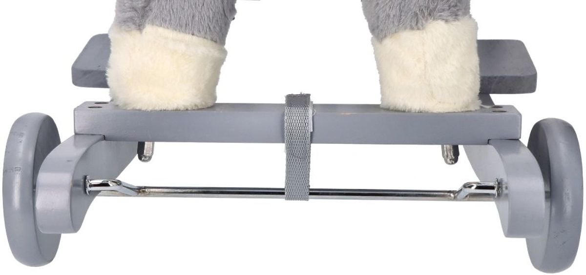Konj ima drvene kotače koji omogućuju da, ovisno o njihovom podešavanju, može biti ljuljački konj ili guralica.