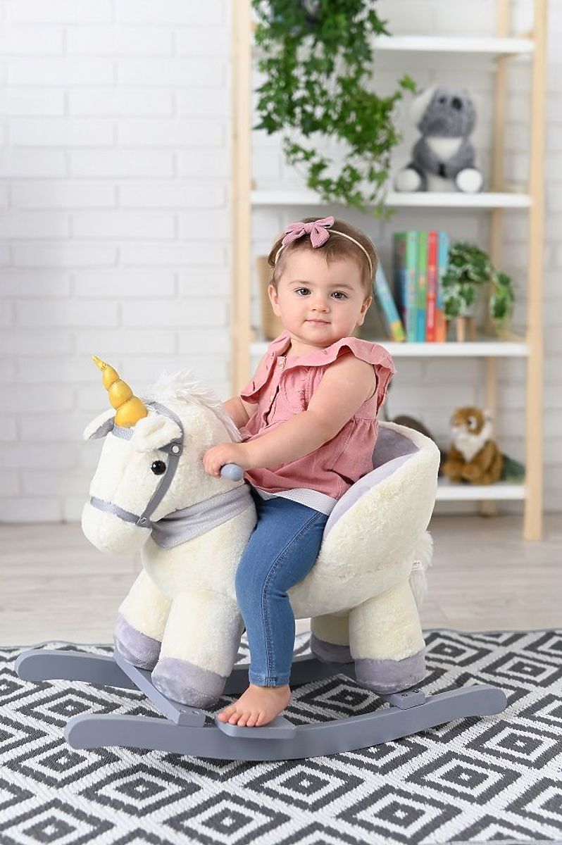 Čarobni ljuljajući jednorog sa zlatnim rogom donijet će vam puno zabave! Djeca će uživati u zvučnim efektima, a roditelji će cijeniti njegovu kvalitetnu izradu i moderan dizajn. Igračka je namijenjena djeci u dobi od 10 mjeseci koja će biti sigurna zahvaljujući naslonu na sjedalu i sigurnosnom pojasu.