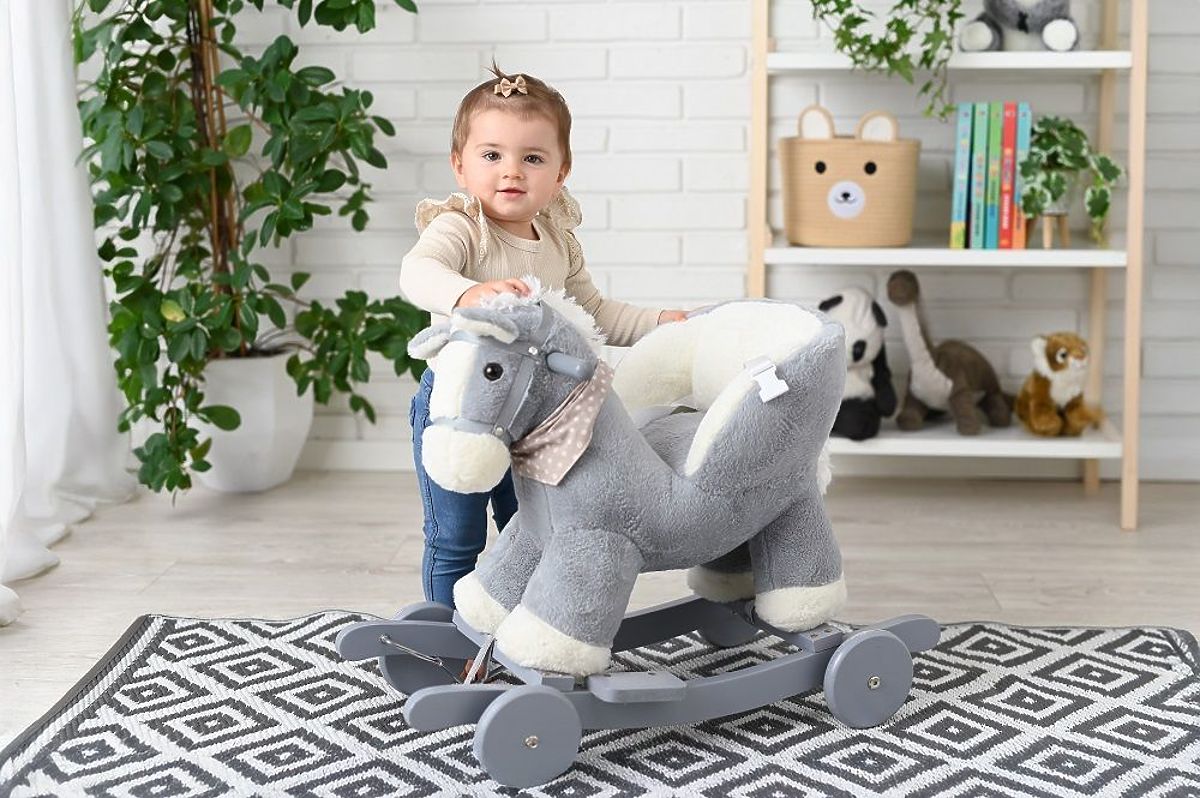 Konjić je izrađen od mekanog i ugodnog plišanog materijala u nježnoj sivoj boji. Klizne letve i ručke izrađene su od drva u sivom tonu, koji se savršeno uklapa u cjelinu. Bijela kopita, bijeli unutarnji dijelovi naslonjača i šal na vratu s simpatičnim točkicama čine konjića neodoljivim.