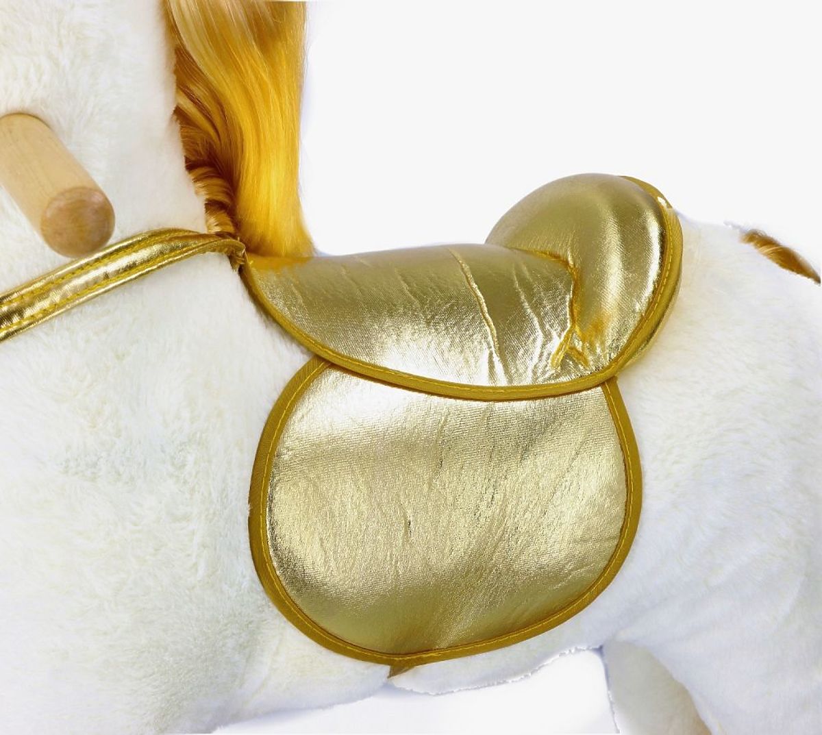 Jednorog je opremljen prekrasnim zlatnim sedlom. Cijeli je izrađen s naglaskom na detalje. Sedlo je posebno oblikovano kako bi dijete sjedilo udobno i ne bi palo unatrag.