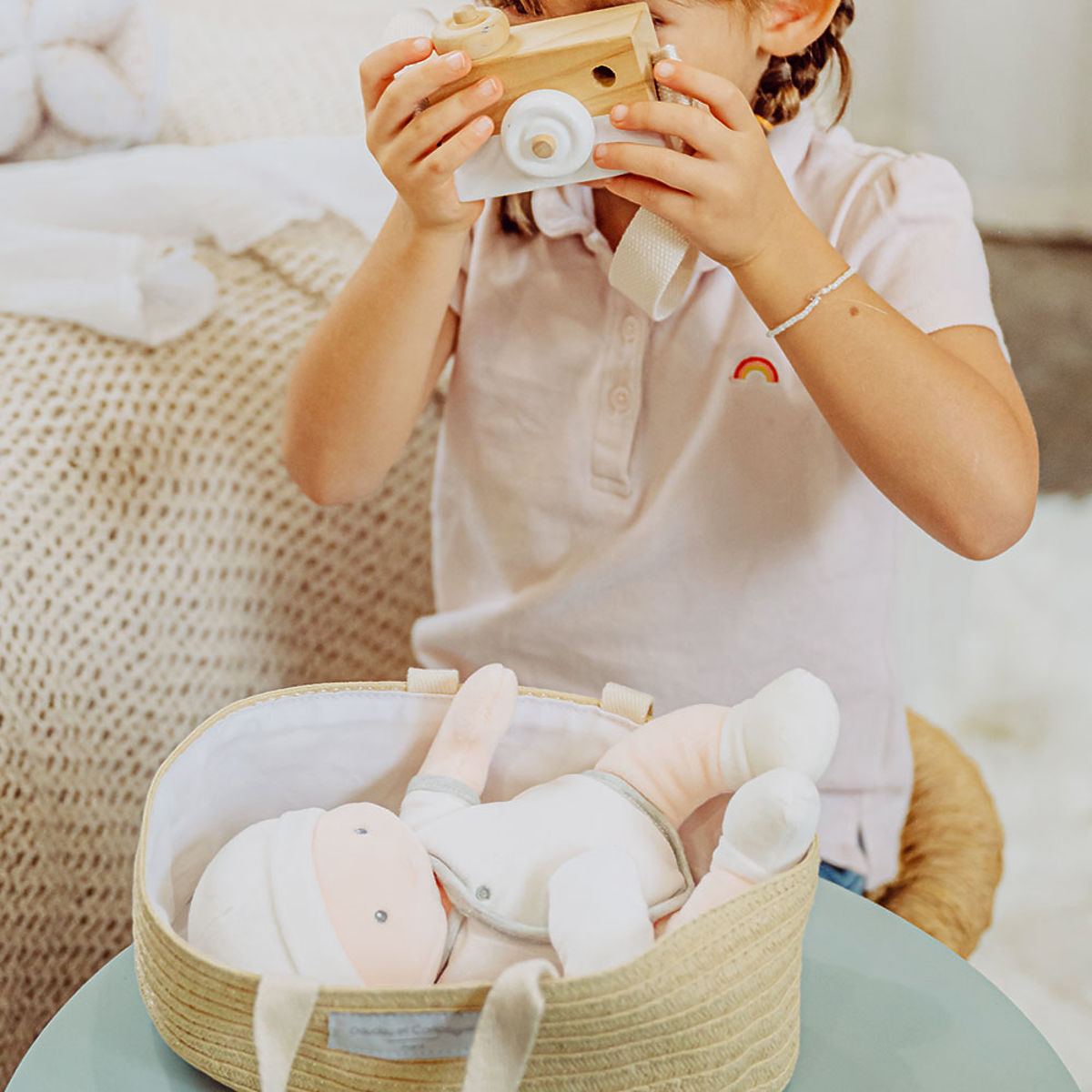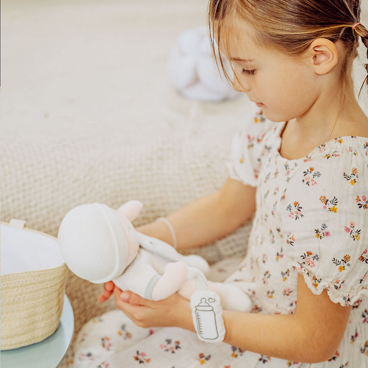 Lutka Pol u prijenosnoj torbi za kolica kao pravo dijete! Ova lutka s kapicom i čarapama je mekana i nježna za svake ručice. Pol ima bijelo-sivi odjevni komplet koji se može skinuti i ponovno obući, a u ruci drži svoju malu bočicu. Zahvaljujući prijenosnoj torbi za kolica, lutka Pol je izvrsna pratiteljica ne samo kod kuće, već i na izletu u park ili kod prijatelja. S ovom lutkom, sati igre su zajamčeni. Održavanje: Perite u kupki na 30°. Preporuka: Prirodno ili sušenje na niskoj temperaturi. Igračka ispunjava europske sigurnosne CE norme. Glavne značajke: prikladno od rođenja, izvezeno lice, oči i usta, slatka beba s dodacima.