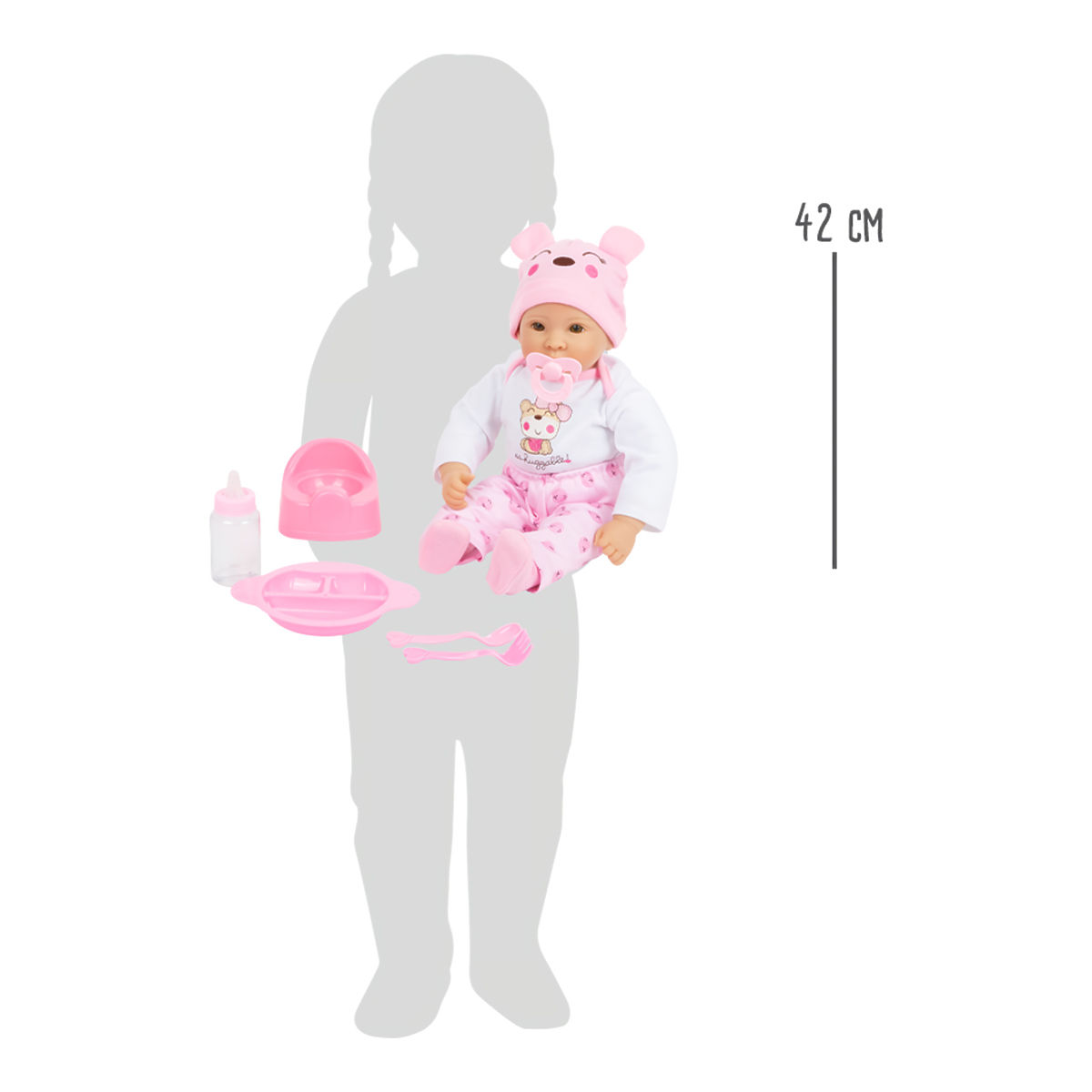Lutka Marie s mekim tkaninskim tijelom, plastičnom glavom i udovima s mnogo dodataka. Odjeća za lutku se lako oblači i skida. U paketu dolazi i dudica u boji, set posuđa, bočica za bebe i noćna posuda. Posebno realističan izraz lica s prekrasnim očima koje ne trepću. Lutke s mekim tijelom su idealne za mlađu djecu čije motoričke vještine još nisu potpuno razvijene. Igra s lutkama potiče razvoj mašte i socijalnih vještina. Savršen suputnik za igru i maženje zahvaljujući mekom tijelu. Ova simpatična lutka je pravo obogaćenje svake kolekcije lutaka. Glavne karakteristike: mekano tkaninsko tijelo, razvija maštu i socijalne vještine, paket uključuje odjeću za lutku, posuđe i noćnu posudu.