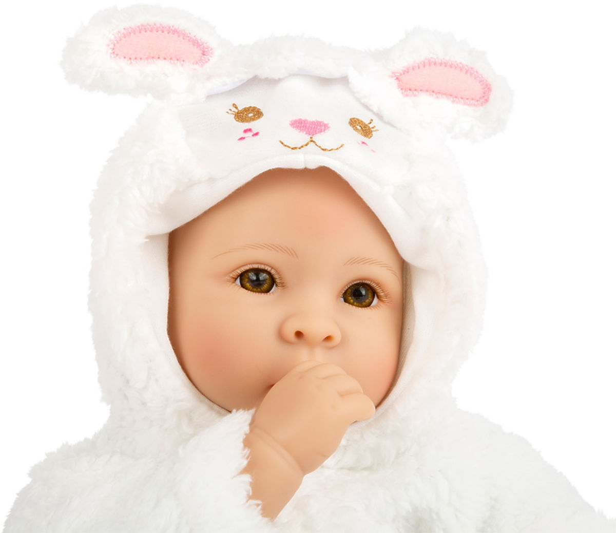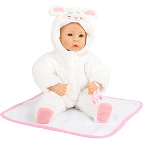 Ova simpatična lutka brzo će osvojiti srca djece! S udobnim mekanim jednodijelnim odijelom u dizajnu ovčice, spremna je za krevet zajedno s plišanom dekom. Glava, noge i ruke izrađene su od meke plastike. Tijelo je od mekog ispunjenog prirodnog materijala i zahvaljujući uspravnom osloncu može sjediti uspravno. Ova šarmantna lutka ne bi smjela nedostajati u nijednom vrtiću. Glavne značajke: mekano ugodno tijelo lutke, detaljno izrađeni netoksični plastični dijelovi - ruke, noge, glava, uključuje plišano odijelo, deku, dudu