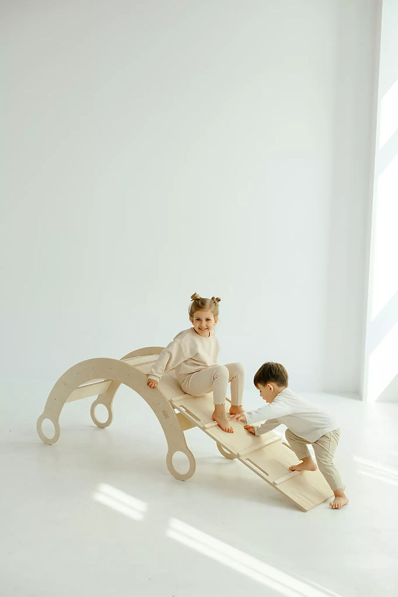 Stilska drvena Montessori ljuljačka s toboganom i ljestvama u prirodnoj boji savršeno se uklapa u svaku dječju igraonicu ili sobu. Ovaj multifunkcionalni set pruža ne samo zabavno ljuljanje, već i mogućnost penjanja po ljestvama i spuštanja po toboganu, čime prirodno podržava razvoj motoričkih vještina, ravnoteže i snage djece.