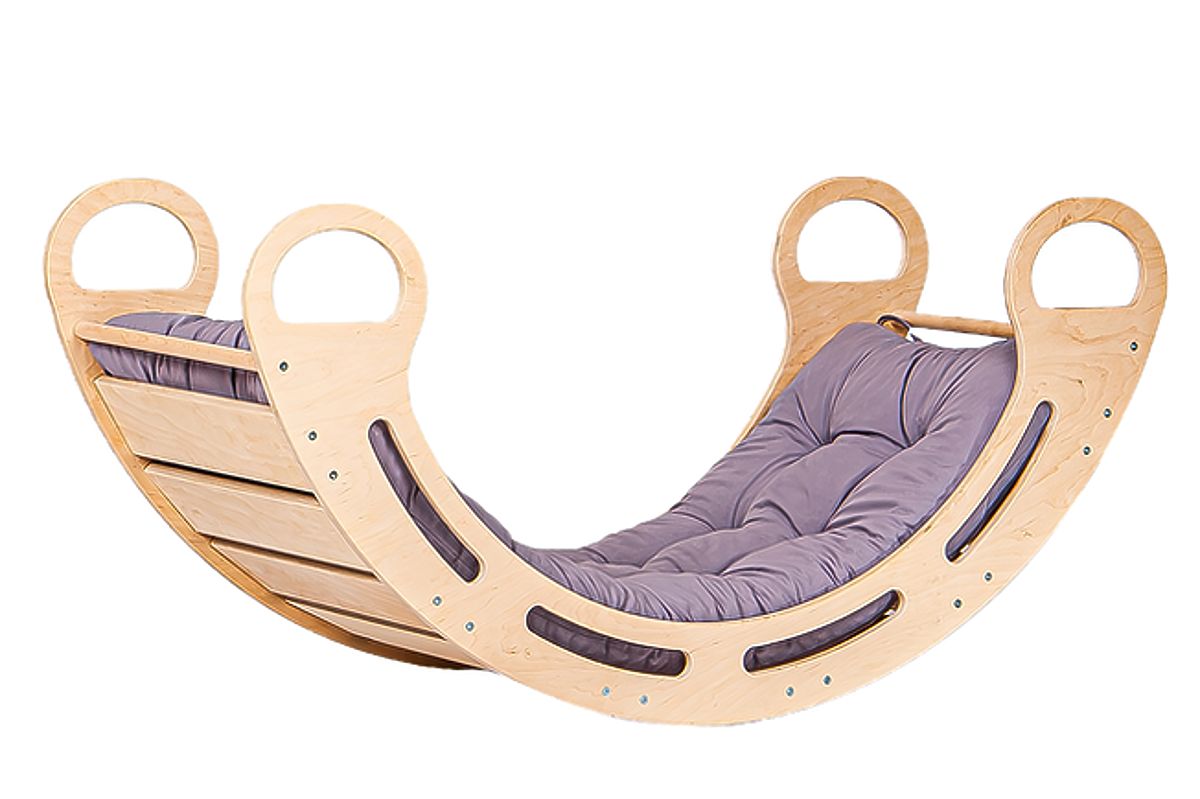 Stilska i sigurna drvena ljuljačka s mekim sivim jastukom potiče dječju maštu i razvija motoriku. Izvrsna kao ljuljačka, ležaljka, kućica ili kolijevka. Izrađena od kvalitetne brezove šperploče s glatkim, zaobljenim rubovima za sigurnu igru već od 12 mjeseci.