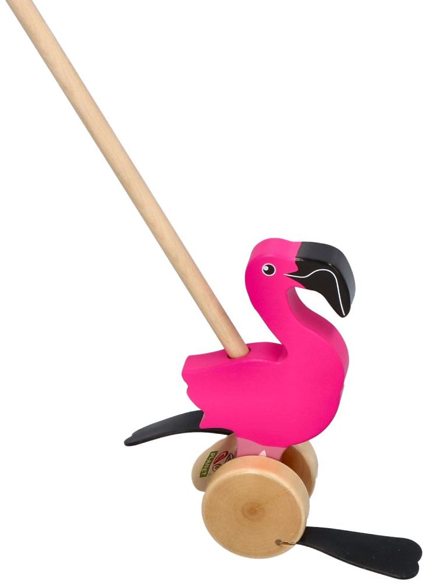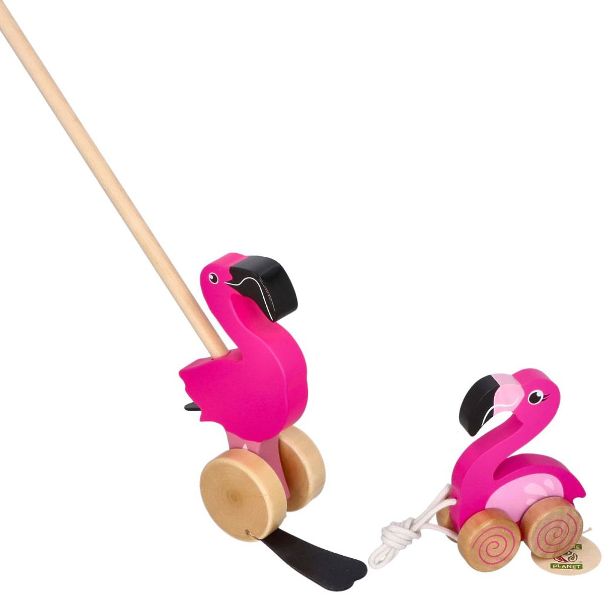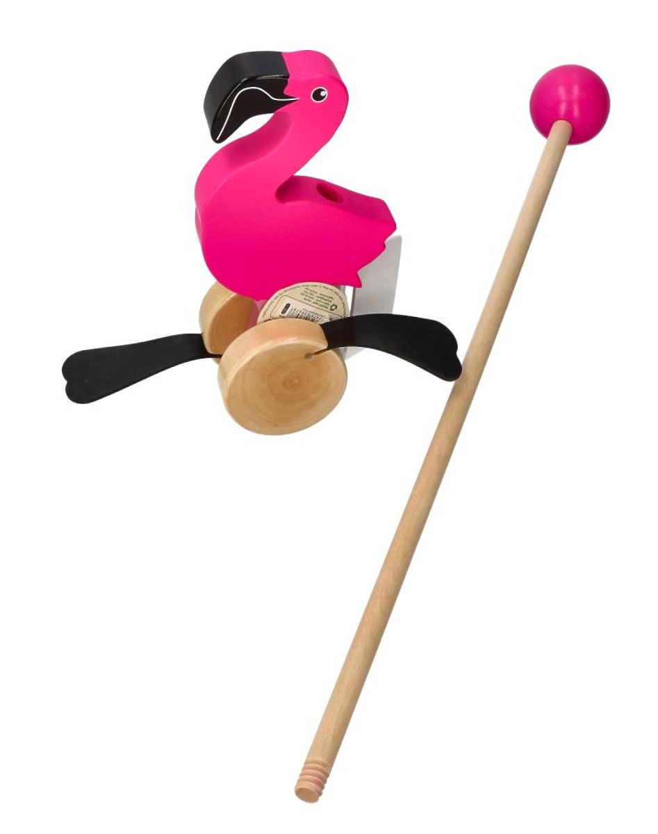 Predstavljamo idealnog suputnika za zajedničke šetnje. Šarmantni ružičasti Flamingo od drva je igračka koja će poticati dijete na kretanje i hodanje. Dijete hvata štap i gura pticu ispred sebe. Kotači pri okretanju uzrokuju udaranje gumenih elemenata o tlo. Štap je završen ručkom kako bi bilo udobno gurati igračku. Štap je pričvršćen vijcima.