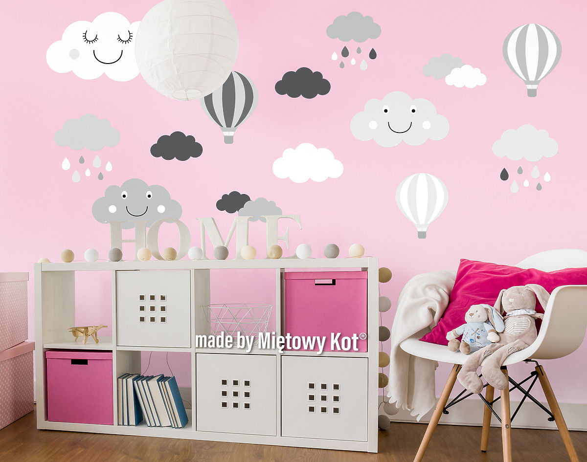 Elegantní dekorace na zeď v podobě krásných mráčků a létajících balónů v šedé barvě. Ideální do dětských pokojíčku.