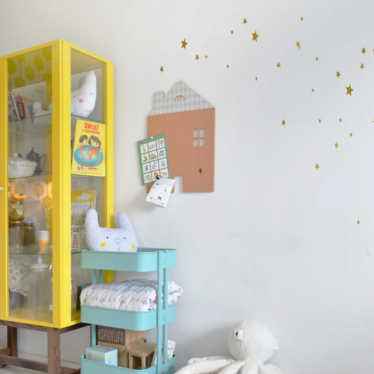 Stylová, praktická nástěnka ve tvaru domku s modrou střechou bude ideálním pomocníkem pro všechny školáky. Díky krásným zlatým hvězdám slouží rovněž jako dekorace pokoje.