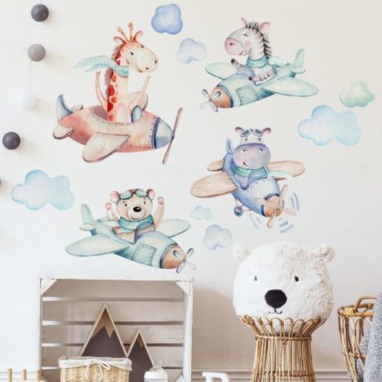 Prekrasna naljepnica s motivom pilota životinja u zrakoplovima. Žirafa, zebra, nilski konj i bakar lete avionima među oblake. Naljepnica je ukrašena svijetlim pastelnim bojama. Oživite dječju sobu slatkim zidnim ukrasom. U rukama imate raspored dijelova na zidu. Ako želite uživati u zabavi, uključite svoju djecu u ukrašavanje.
