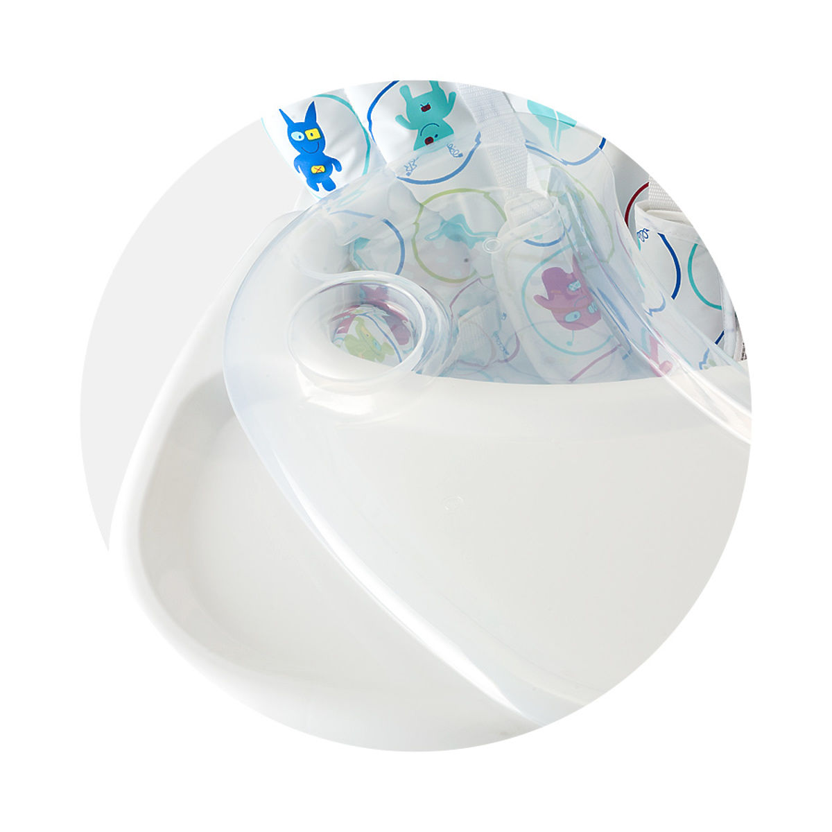 Součástí židličky je 5 bodový nastavitelný pás a dvojitý tác. Horní tác je možné vyndat a vyčistit. Tác je vyrobený s bezpečnostní T přepážkou, která brání vypadnutí dítěte. Tácek je možné nastavit do tří poloh, podle věku dítěte.