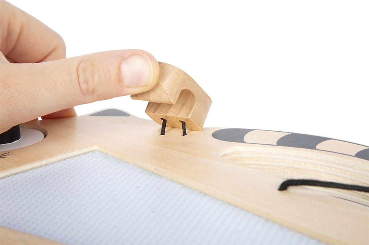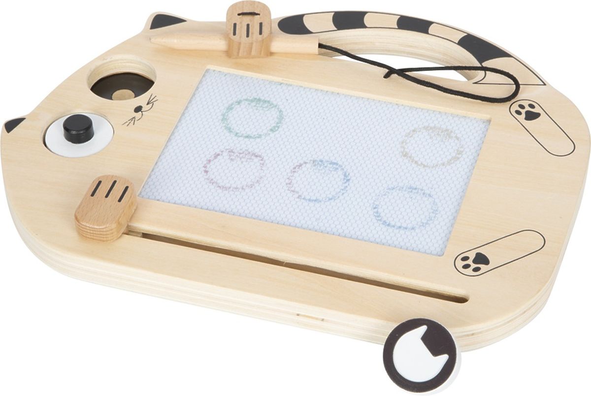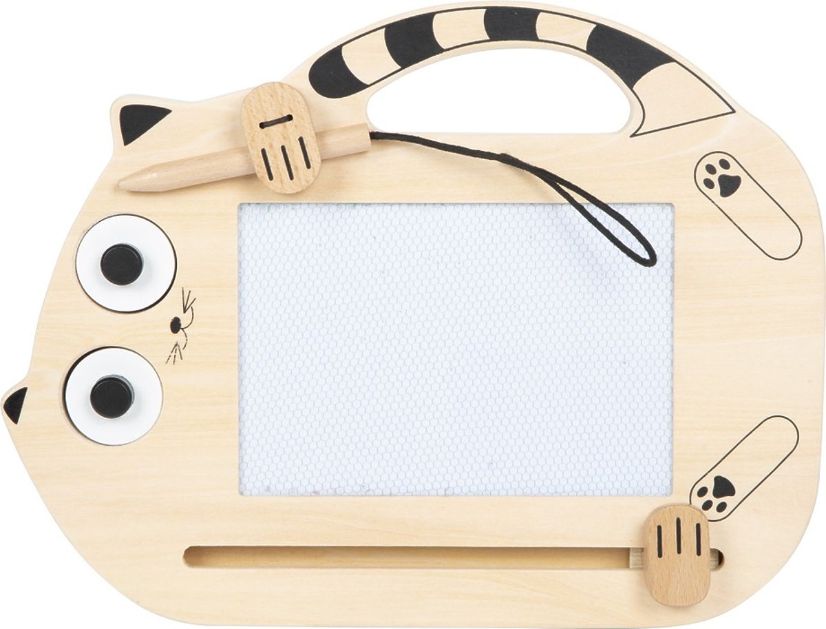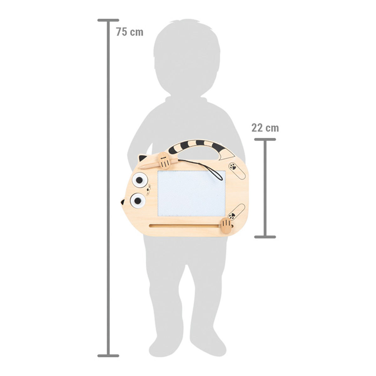Kreativna zabava za male umjetnice i umjetnike! Magnetna ploča za crtanje u obliku mačke idealna je za djecu koja vole crtati. Pomoću olovke mogu se iznova i iznova stvarati novi crteži. Dva pečata s motivima mačjih očiju i mačje glave nude dodatne mogućnosti stvaranja jedinstvenih umjetničkih djela. Kada se olovka ne koristi, može se sigurno pričvrstiti ispod mačje šape, a zahvaljujući tome što je pričvršćena uzicom za ploču, neće se izgubiti. Kada je remek-djelo završeno ili želite stvoriti nešto novo, sliku možete jednostavno izbrisati pomoću klizača – tako je sve spremno za daljnje stvaranje u trenu! Zahvaljujući integriranoj ručki za nošenje i kompaktnoj veličini, ploča se može ponijeti bilo gdje. Uživajte u kreativnoj zabavi koja ne prestaje ni na putovanjima! Glavne značajke: s drvenom olovkom i 2 pečata, olovka pričvršćena uzicom za ploču ispod šape, beskonačno crtanje s magičnom gumicom, s ručkom za nošenje, izrađeno od visokokvalitetnog drva, pogodno i za putovanja.