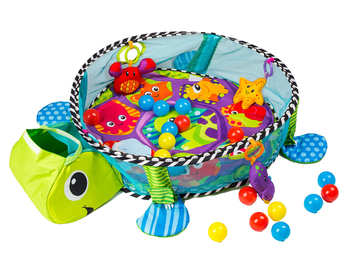 Glava kornjače služi kao sklonište za obojene kuglice koje su dio paketa. Uz bočne stranice jastučića nalaze se zasuni za učvršćivanje šipki s visećim igračkama. Za stariju djecu možete iz otirača stvoriti malu igraonicu s igračkama i kuglicama.