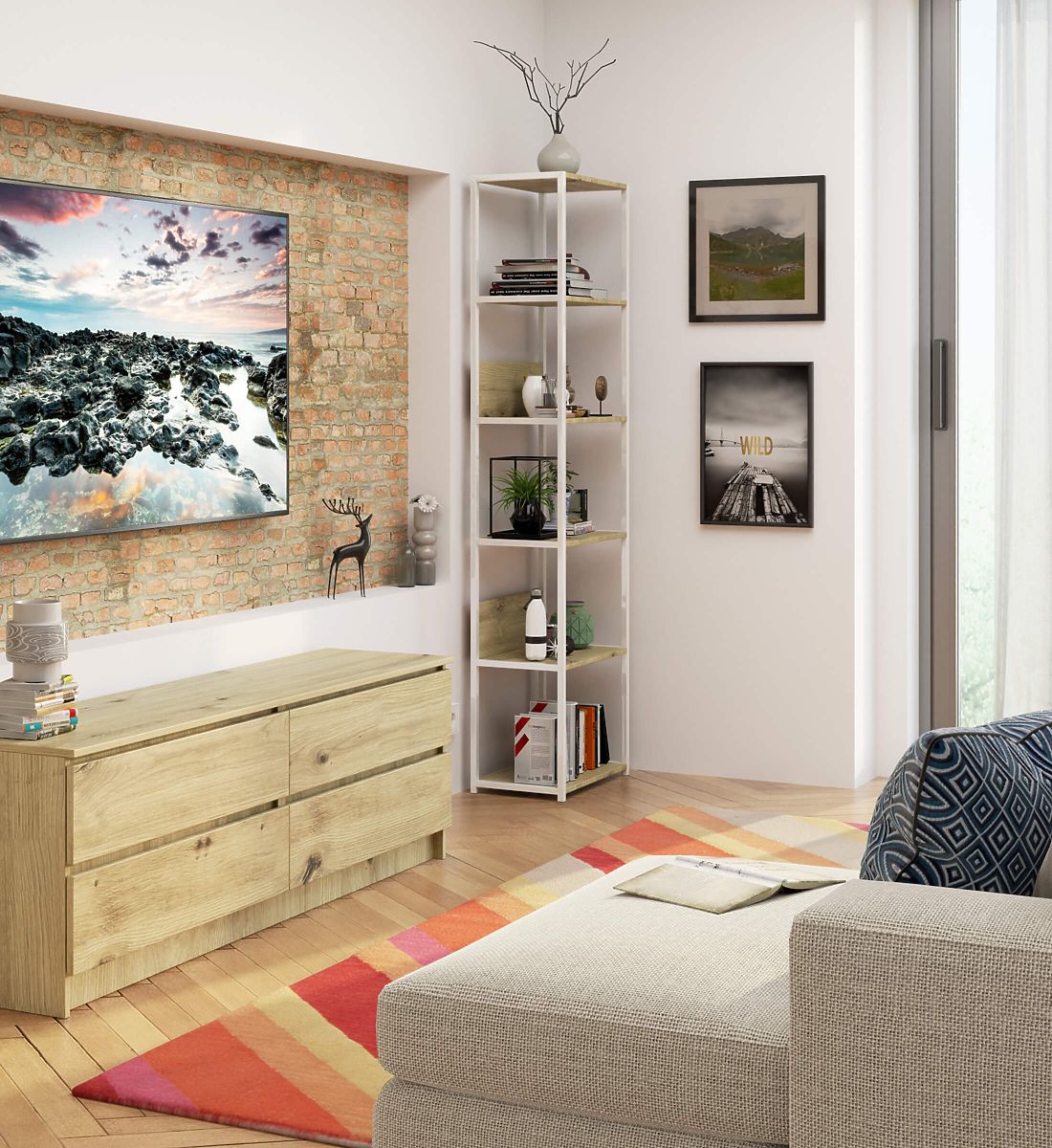 Metalni loft regal je praktičan i moderan komad namještaja koji se uklapa kako u dnevni boravak, tako i u ured. Regal s bijelim metalnim okvirom i 6 polica u boji Hrast Artisan. Police regala izrađene su od laminirane ploče debljine 16 mm. To je izdržljiv i otporan materijal koji se odlikuje visokom otpornošću na habanje. Rubovi su dodatno zaštićeni ABS rubom, zahvaljujući čemu će namještaj i dalje izgledati dobro, čak i pri vrlo intenzivnoj svakodnevnoj upotrebi. Regal je opremljen s 6 polica na koje se mogu postaviti predmeti koje želimo izložiti ili imati jednostavno pri ruci. Ukupno djeluje vrlo stilski i moderno.