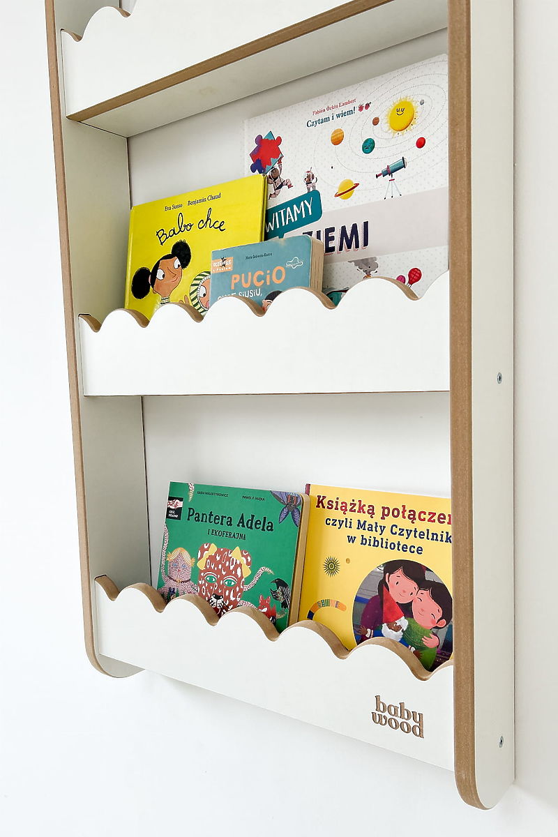 Polica WAVE L u bijeloj boji je praktična i dekorativna zidna knjižnica koja pomaže održati red u dječjoj sobi bez zauzimanja prostora na podu. Idealna je za knjige, sitne igračke, fotografije ili druge dragocjene predmete vašeg djeteta. Zahvaljujući montaži na zid, pod ostaje slobodan za igru i kretanje, što cijene i djeca i roditelji. Elegantni i funkcionalni dizajn police omogućuje jednostavno pohranjivanje i izlaganje omiljenih stvari djeteta. Zaobljeni rubovi i kvalitetna izrada osiguravaju sigurnu uporabu i za malu djecu.