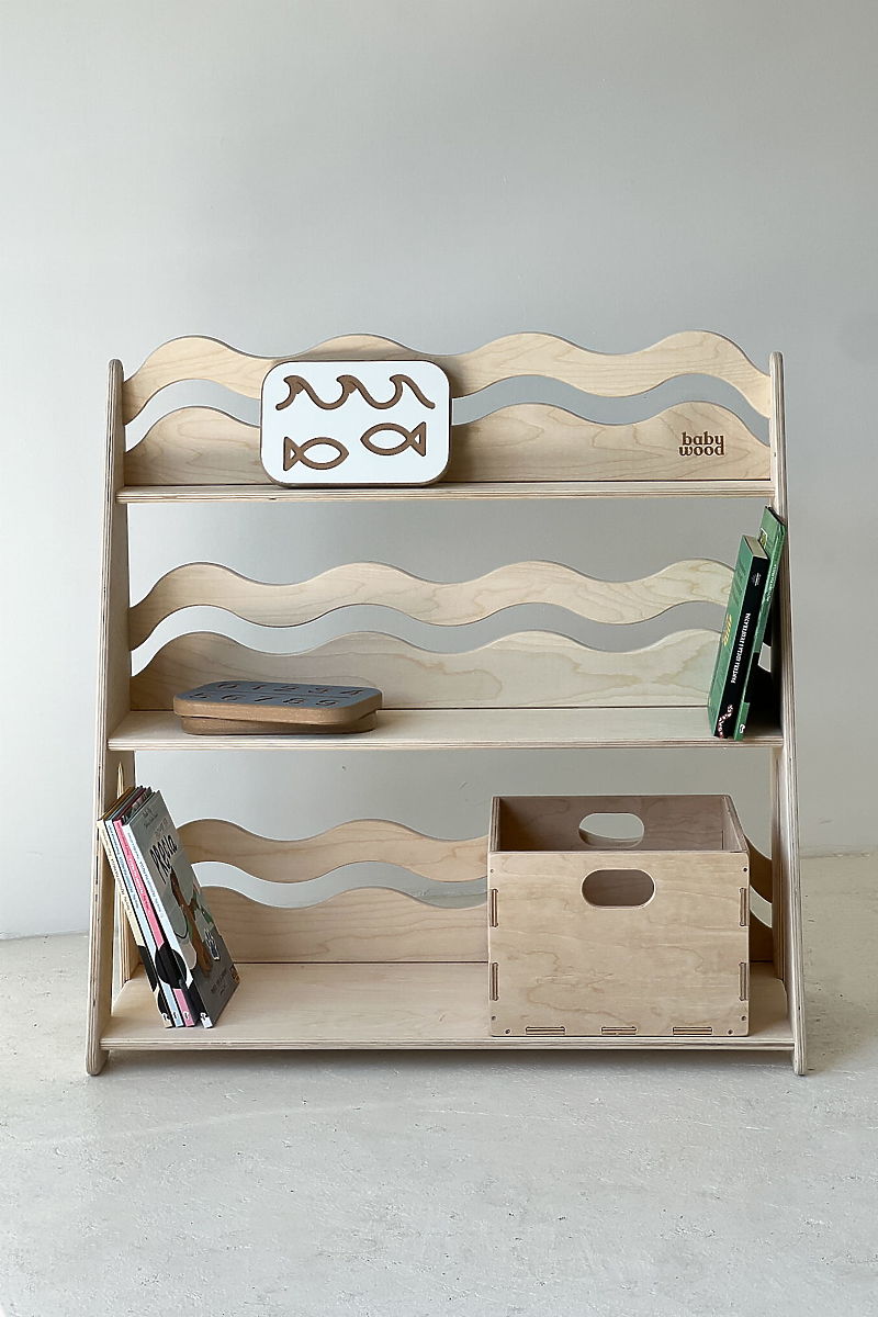 Zidna polica WAVE M u prirodnoj boji je praktična i dekorativna knjižnica za dječju sobu, dizajnirana u duhu Montessori. Pomaže djetetu održavati red i istovremeno potiče njegovu samostalnost – sve što dijete treba lako je dostupno bez pomoći odraslih. Tri otvorene police omogućuju pohranu knjiga, igračaka i svih malih blaga djeteta. Valovite prednje letvice daju polici lakoću i vizualno omekšavaju jednostavan oblik. Prirodni materijali i sigurna izrada jamče stabilnost i dugovječnost, dok djeci pružaju siguran i pregledan prostor za igru.