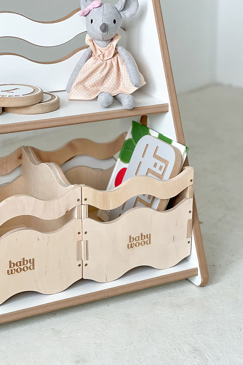 Polica za knjige i igračke s valovitim frontama i prirodnim materijalima. .. više