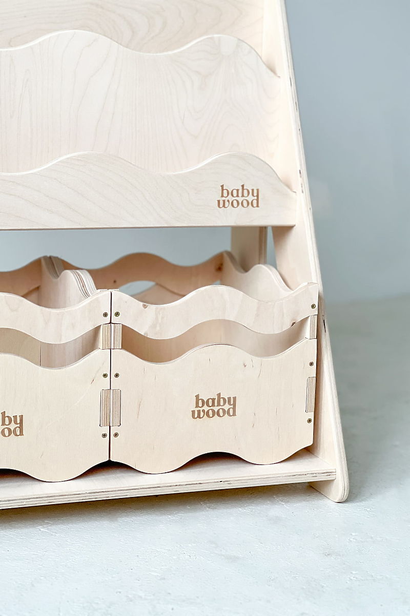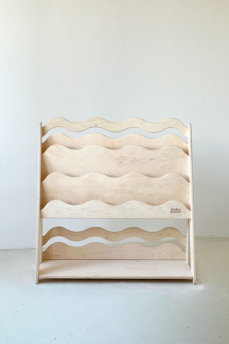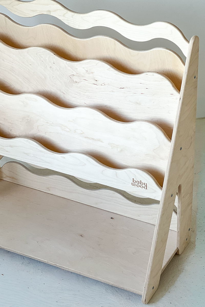 Polica WAVE M u prirodnoj boji praktično spaja dvije funkcije u jednom komadu namještaja – gornji dio služi kao polica za dječje knjige, dok donji dio nudi prostor za pohranu igračaka. Idealno rješenje za dječju sobu gdje je potrebno štedjeti prostor i istovremeno održavati preglednost. Valovite prednje letvice daju polici nježan, razigran izgled i istovremeno su sigurne za malu djecu. Zahvaljujući pristupačnoj visini, dijete lako može samo dohvatiti knjige i igračke, što podržava njegovu samostalnost i prirodni razvoj u duhu Montessori.