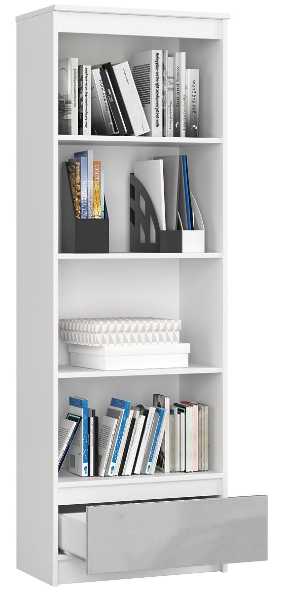 Regal je komad namještaja koji će pronaći primjenu u svakom domu. Može služiti za pohranu knjiga, fascikala i registratora s dokumentima, fotoalbuma, ali i okvira, suvenira ili mnogih drugih predmeta. Najčešće se može vidjeti u dječjoj sobi, dnevnom boravku ili kućnom uredu, ali se odlično uklapa i u uredske prostore. Predstavljeni regal je kombinacija dobre cijene, funkcionalnosti, kvalitete i dizajna. Zaslužuje priznanje zahvaljujući kombinaciji dviju najmodernijih i istovremeno bezvremenskih boja - bijele i sive. Regal se sastoji od četiri velike police i prostrane ladice. Ormar je vrlo stabilan, odlikuje se čvrstom konstrukcijom i pažnjom na detalje. Izrađen je od laminirane ploče s iznadprosječnom trajnošću i otpornošću na habanje. Prednje strane su dizajnirane u sivoj boji s sjajem, što cijelom komadu daje jedinstven karakter. Pozivamo vas da se upoznate i s ostalim elementima uredskog namještaja iz ove kolekcije.