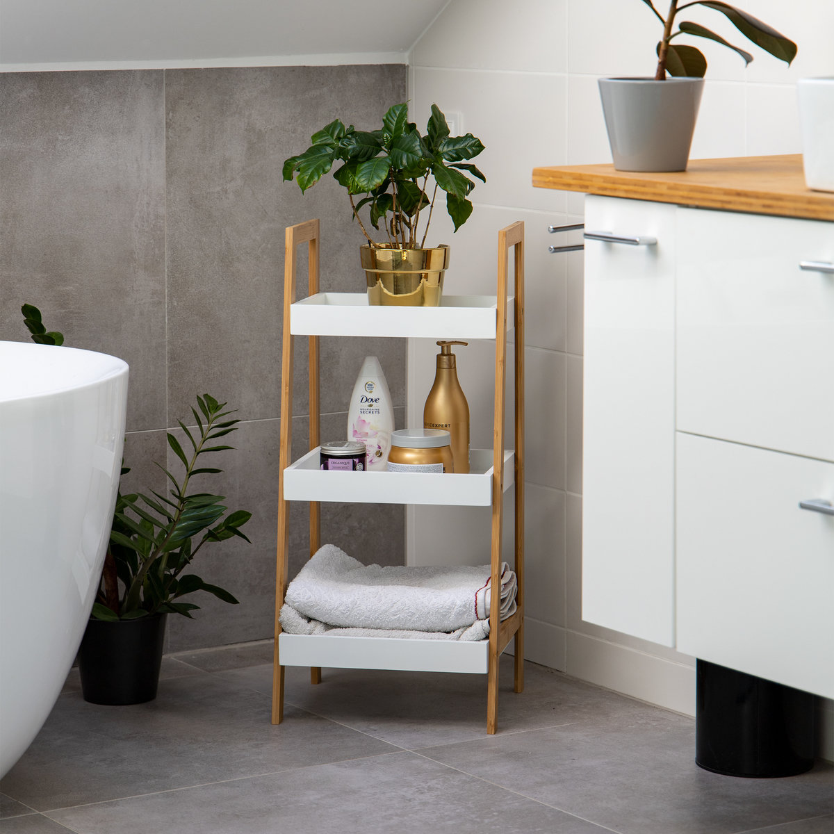 Stalak s policama Bamboo u zanimljivoj kombinaciji bambusovog drveta s bijelim policama, savršen je za bilo koju vrstu interijera.