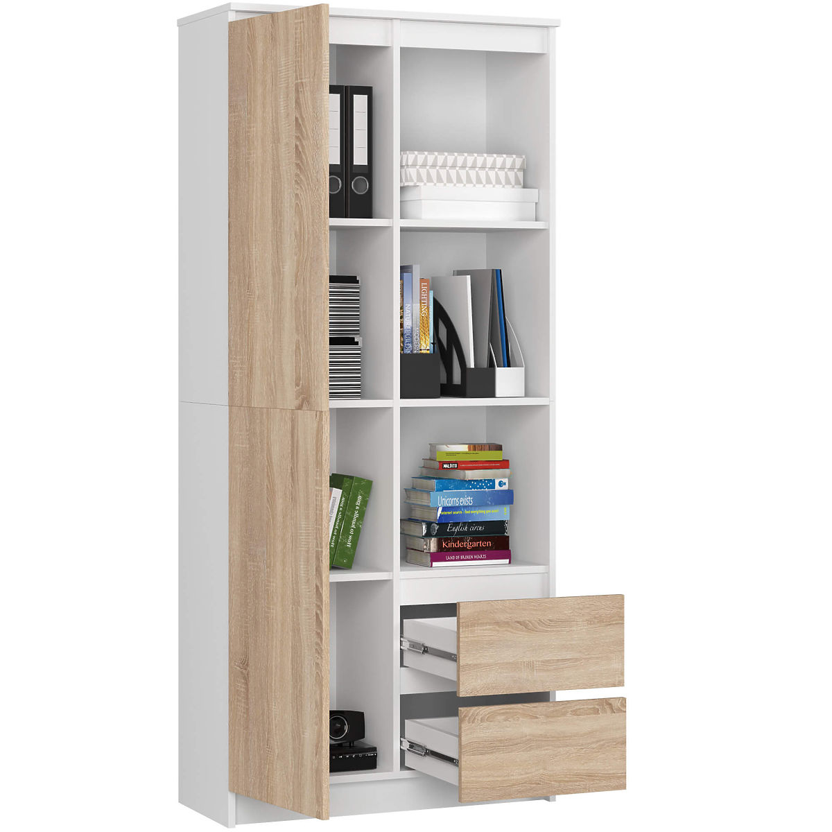 Uredski regal s vratima i ladicama u kombinaciji bijele i sonoma boje.