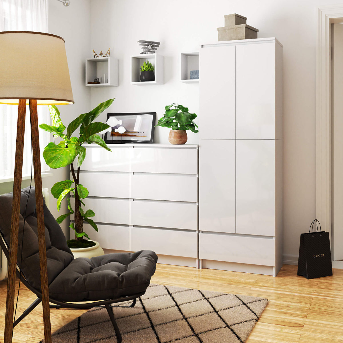 Bijela uredska knjižnica s ladicom savršena je kombinacija funkcionalnosti i vizualne privlačnosti. Namještaj je praktičan i lako se održava u savršenoj čistoći, a istovremeno je vrlo efektan. U zatvorenom dijelu nalaze se prostrane police, dok se u donjem dijelu nalazi prostrana i lako izvlačiva ladica. Upotreba knjižnice vrlo je univerzalna i ovisi o individualnim potrebama. U ormaru se mogu pohraniti knjige, registratori s dokumentima i uredski pribor, kao i stolno posuđe, stolnjaci ili ručnici. Boja klasične bijele i jednostavan oblik knjižnice osiguravaju da se namještaj uklapa u bilo koji interijer, bez obzira na boju zidova ili stil u kojem je uređen. Namještaj je izrađen od izdržljivog materijala, laminirane ploče otporne na habanje i oštećenja. Rubovi ormara obloženi su izdržljivim i estetskim ABS rubom. Fronte knjižnice lakirane su na visoki sjaj, što namještaju daje dodatnu eleganciju. Gornja i donja vrata spojena su u jednu cjelinu i ne otvaraju se zasebno.