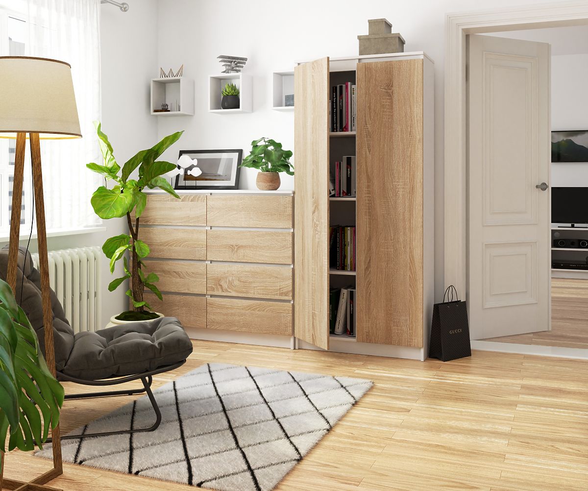 Uredski ormarić R 80 cm Clip 2 je namještaj u boji bijela/sonoma, što je jedna od najpopularnijih boja ove sezone. Ova knjižnica donijet će red i harmoniju u vaš ured. Opremljena je s osam prostranih polica u koje možete pohraniti sve potrebne stvari u uredu. Osim toga, rubovi su prekriveni ABS rubom koji pruža visoku zaštitu od oštećenja. Prednosti ove knjižnice uključuju:
