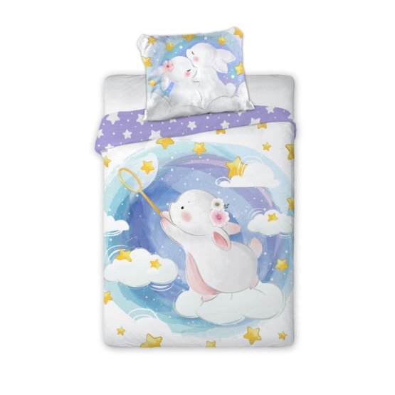 Posteljina se sastoji od navlake za poplun 135 x 100 cm i jastučnice 60 x 40 cm . Premazi su dvostrani . Na prednjoj strani vidjet ćemo zečiće na oblaku, zvjezdice oko njih, a na suprotnoj strani naslovnice su bijele zvjezdice i male točkice na ljubičastoj pozadini. Posteljina je opremljena praktičnim patentnim zatvaračem koji olakšava prekrivanje jastuka i popluna.