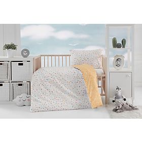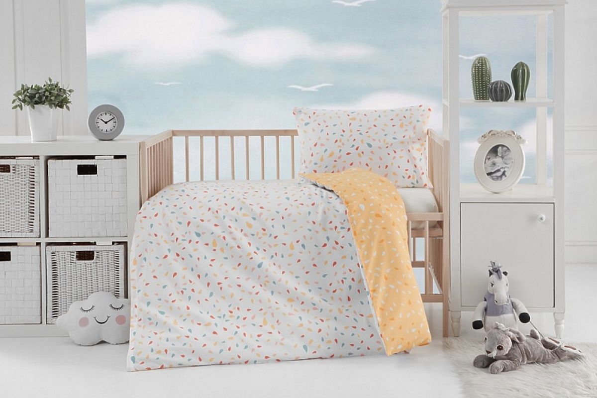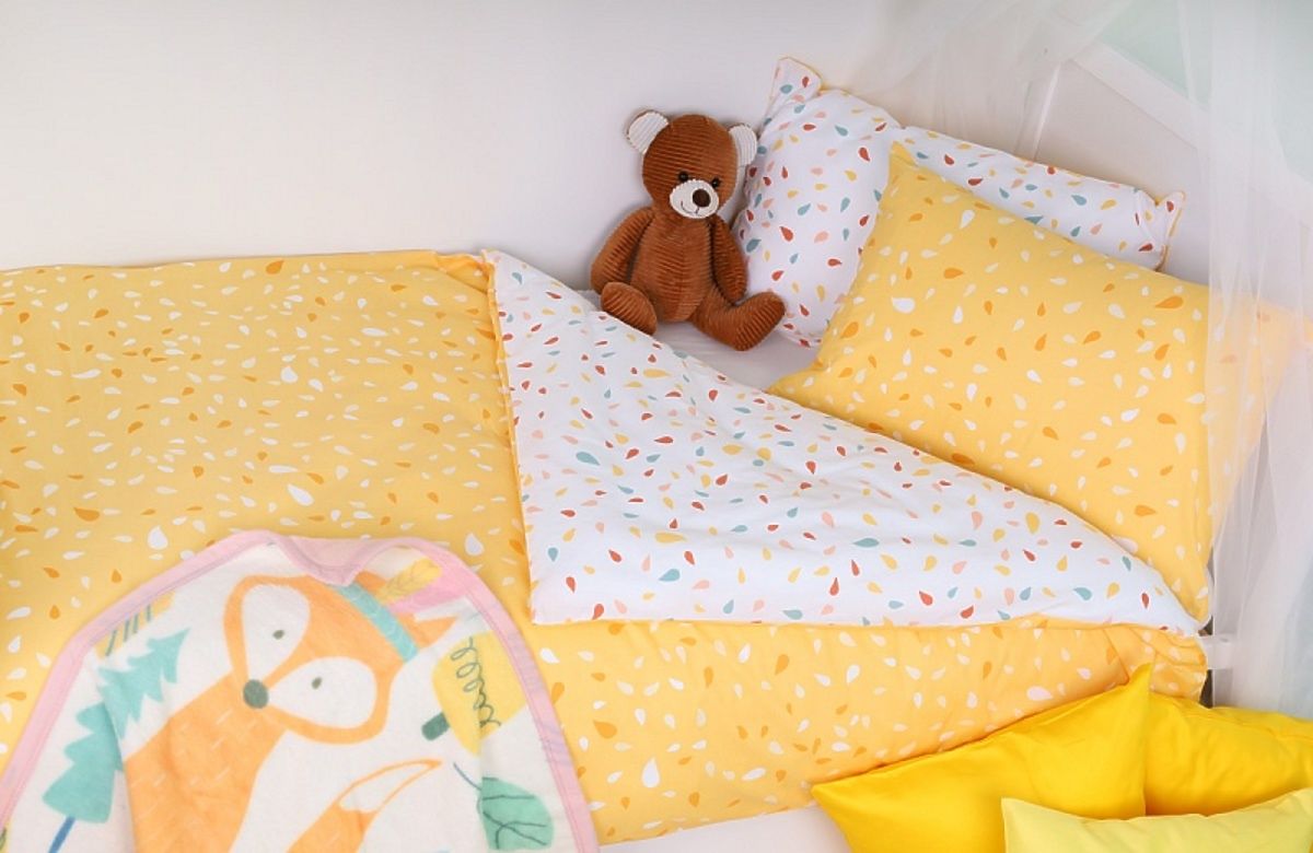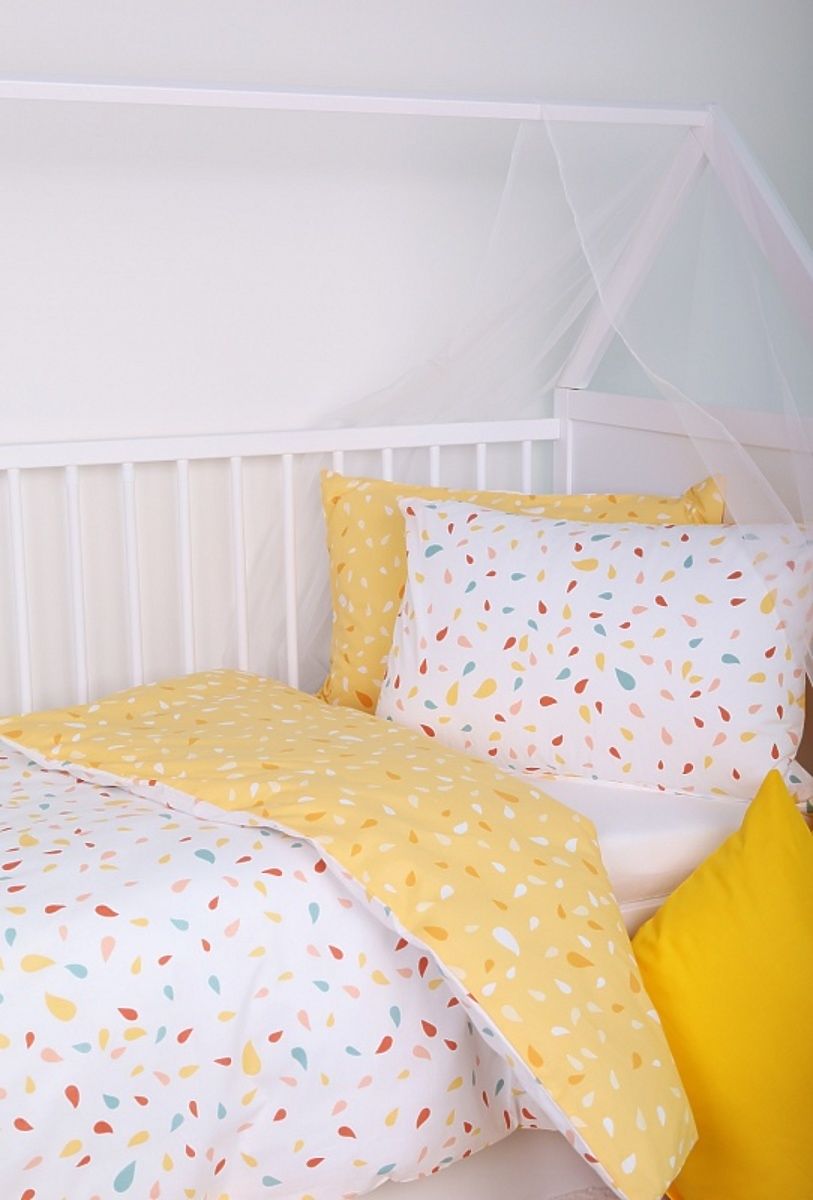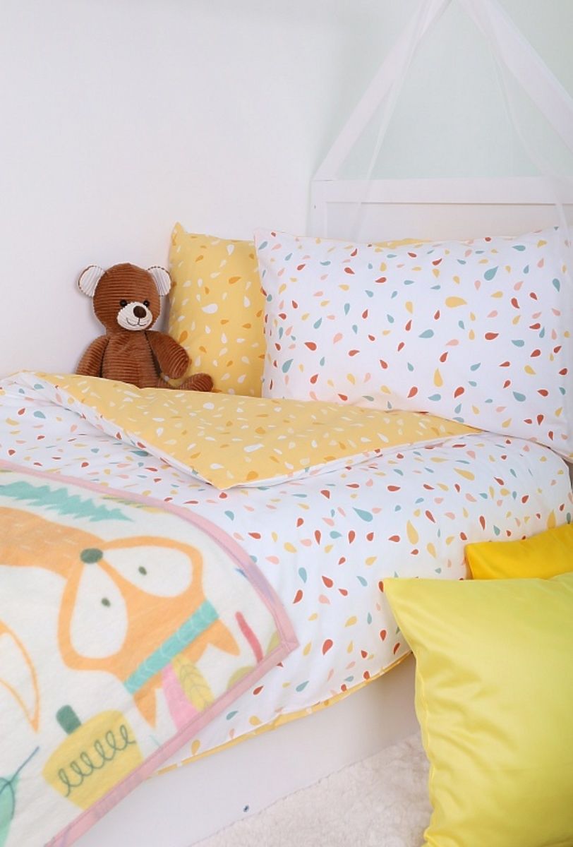 Moderna posteljina s nježnim motivom kapljica bit će izvrstan dodatak svakoj prostoriji. Gornja strana je ukrašena žutim, ružičastim, crvenim i plavo-zelenim kapljicama na bijeloj podlozi. S donje strane nalaze se bijele i tamnožute kapljice na medenoj podlozi. Zahvaljujući neutralnim kombinacijama boja, isticat će se iu djevojačkoj iu dječačkoj sobi.