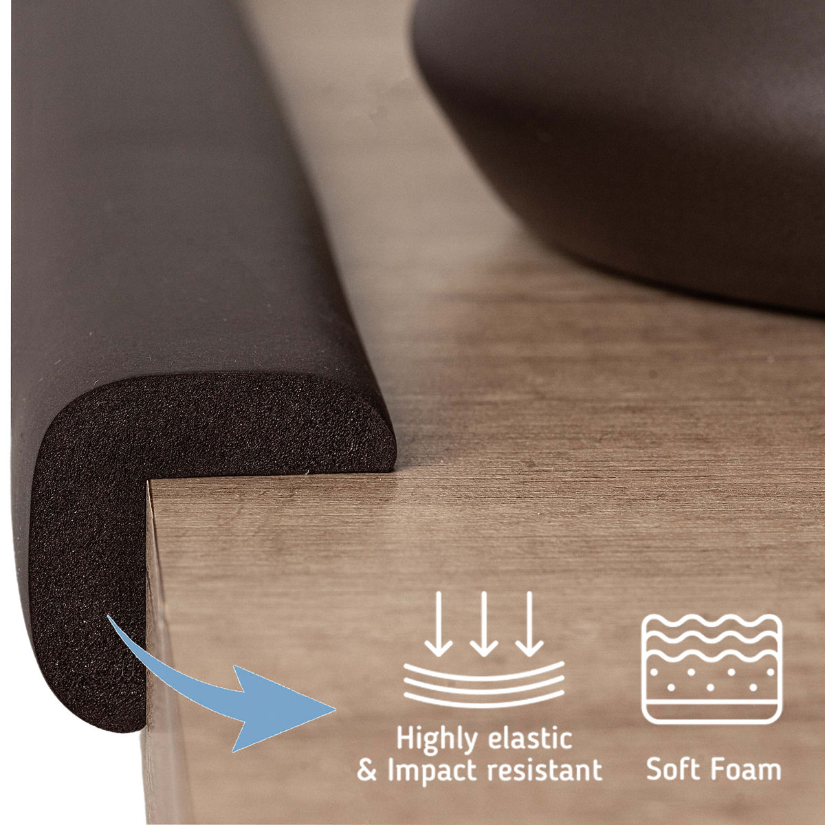 Smeđa pjenasta traka je za kutove i druge oštre rubove koji mogu uzrokovati ozljede. Zaštita od oštrih rubova i kutova vrlo je korisna posebno za malu djecu koja uče hodati i trčati po kući.