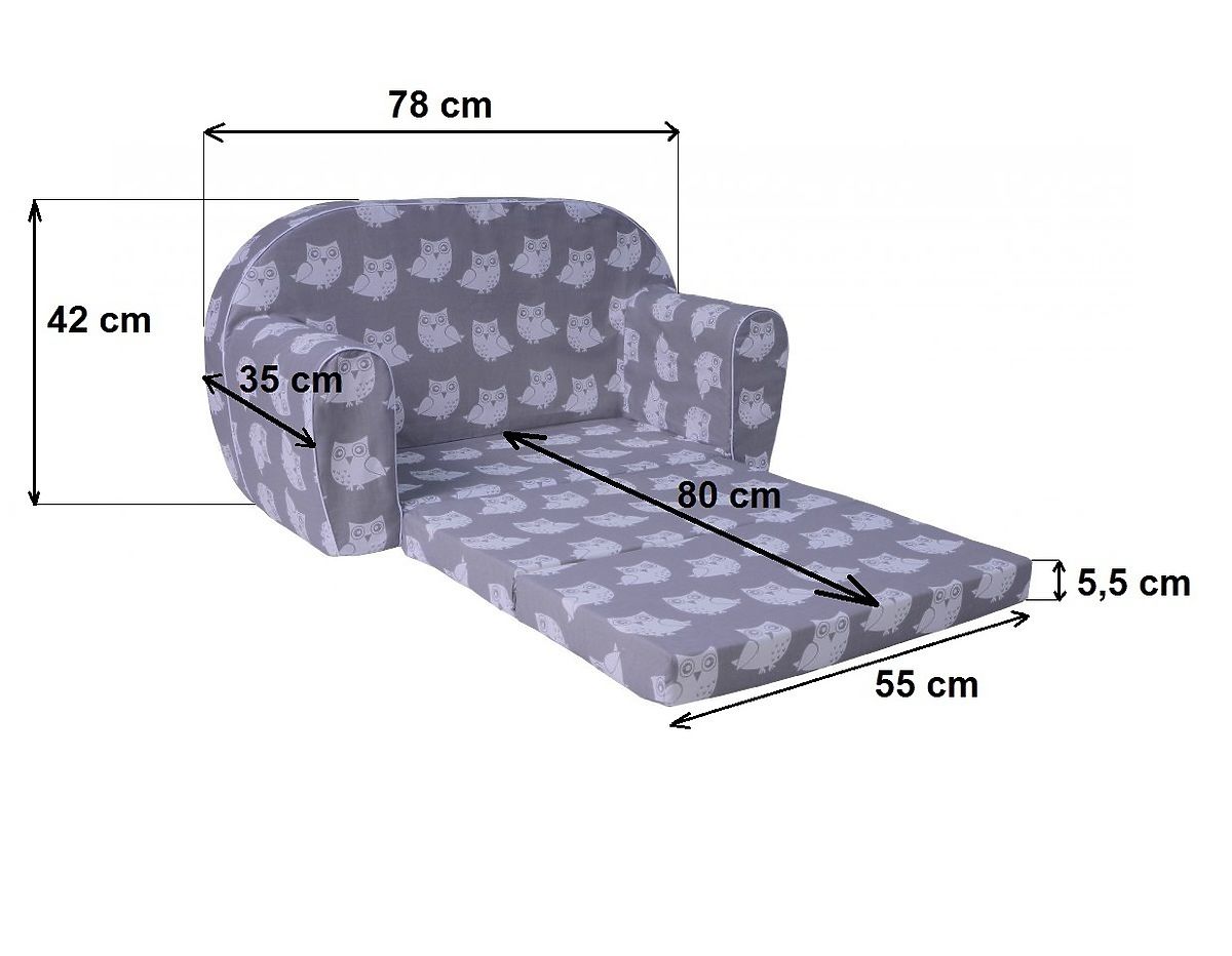 Kauč u rasklopljenom stanju iznosi do 80 cm i dizajniran je tako da na njom može udobno sjediti 2 djece. Bit će prikladan ne samo za dječje sobe, već i za dječje vrtiće ili dječje kutke.