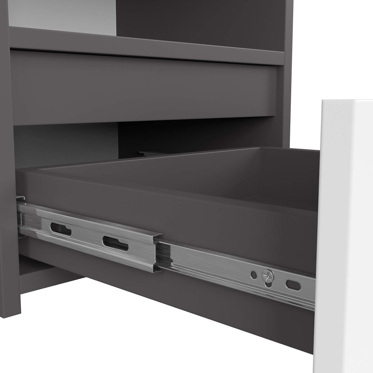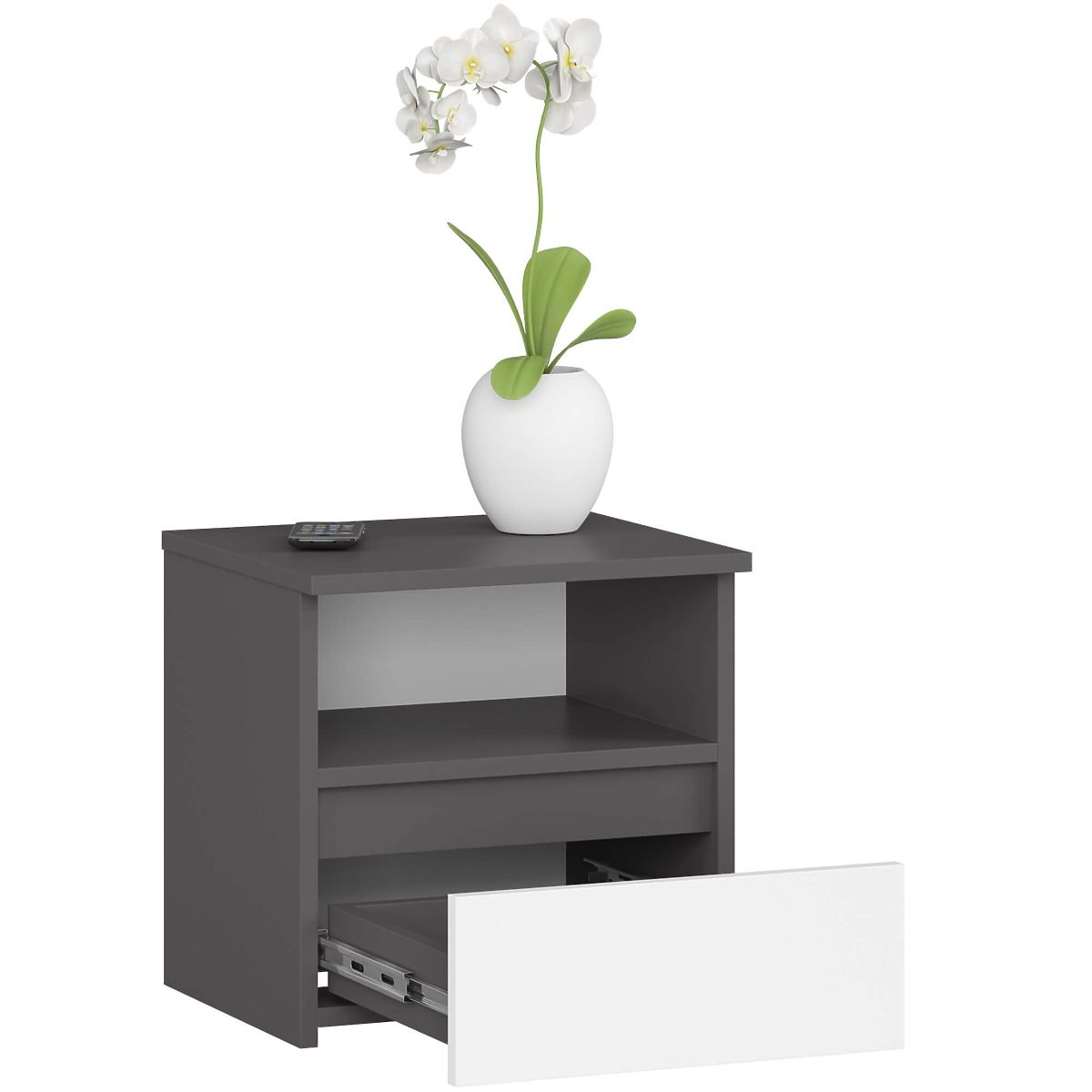 Noćni ormarić CL1 u grafit sivoj boji s bijelim prednjim stranama. .. više