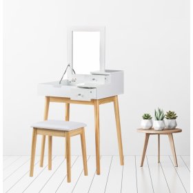 Stol ima dvije prostrane ladice i još jedan prostor za odlaganje, koji je skriven ispod nagibnog dijela stola s ugrađenim ogledalom. Paket uključuje udobnu tapeciranu stolicu.
