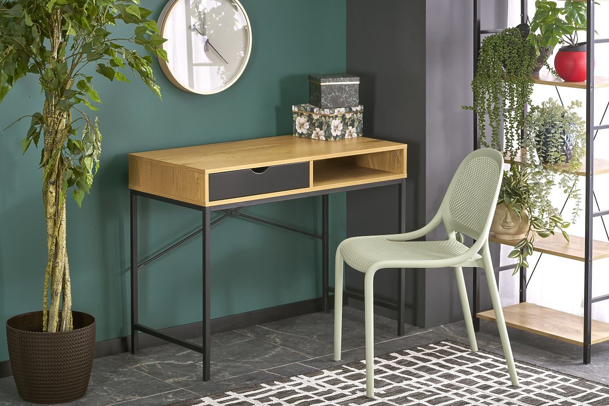 Pisaći stol B-50 idealan je izbor za školarce, studente i kućne radne kutke. Zahvaljujući svom jednostavnom, ali modernom dizajnu u dekoru zlatnog hrasta dopunjenom crnim metalnim nogama, lako se uklapa u svaki interijer – od studentske sobe do kućnog ureda. Stol nudi praktično rješenje za pohranu u obliku jedne ladice i otvorene police, gdje možete pohraniti bilježnice, knjige, uredski pribor ili malu elektroniku. Radna površina je dovoljno velika za prijenosno računalo, lampu i druge potrepštine. Laminat korišten za izradu stola je otporan na ogrebotine, udubljenja i prljavštinu, što osigurava dug životni vijek i jednostavno održavanje.
