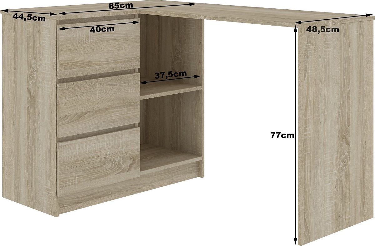 Kutni pisaći stol s tri ladice u hrastu sonoma i bijeloj boji. .. više