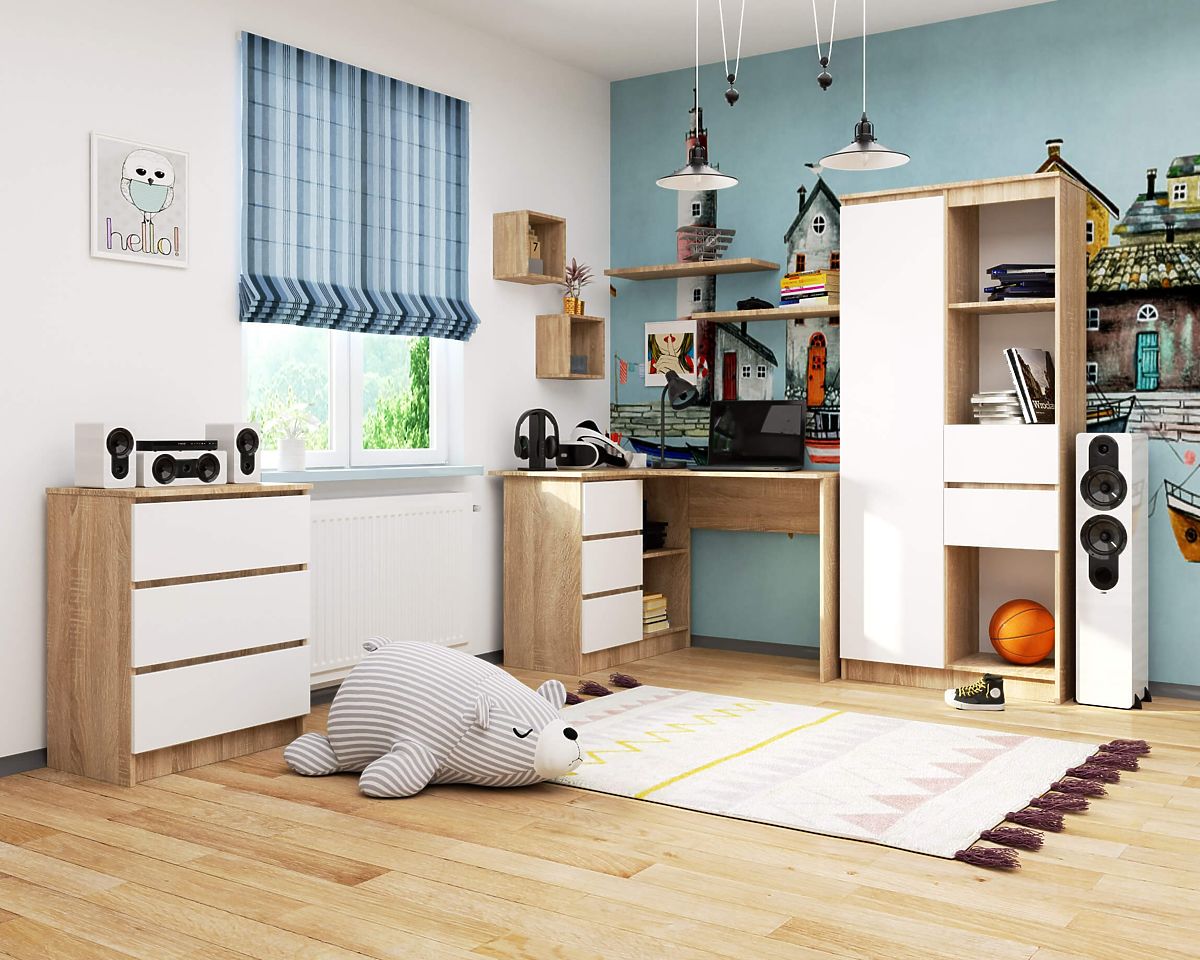 Kutni pisaći stol opremljen s tri ladice zanimljiva je ponuda za one koji preferiraju moderno uređene uredske interijere. To je nježna kombinacija klasične bijele i vrlo moderne boje, hrast sonoma. Namještaj se sastoji od pisaćeg stola, dviju otvorenih ormarića i ladica. Predstavljena ponuda dobro se uklapa u svaki ured gdje je važno što funkcionalnije iskoristiti prostor. Za izradu je korištena laminirana ploča debljine 16 milimetara - izdržljiv materijal s visokom otpornošću na oštećenja. Kutni računalni stol zasigurno će zadovoljiti i najzahtjevnije kupce, kojima su važni izgled, kvaliteta i funkcionalnost. Pozivamo vas da upoznate i ostali namještaj iz ove kolekcije - komode, police i ormare, koji su dostupni u istoj kombinaciji boja. Zahvaljujući njima, sigurno ćete stvoriti odgovarajući prostor za uredski rad ili učenje - kako kod kuće, tako i u uredu.