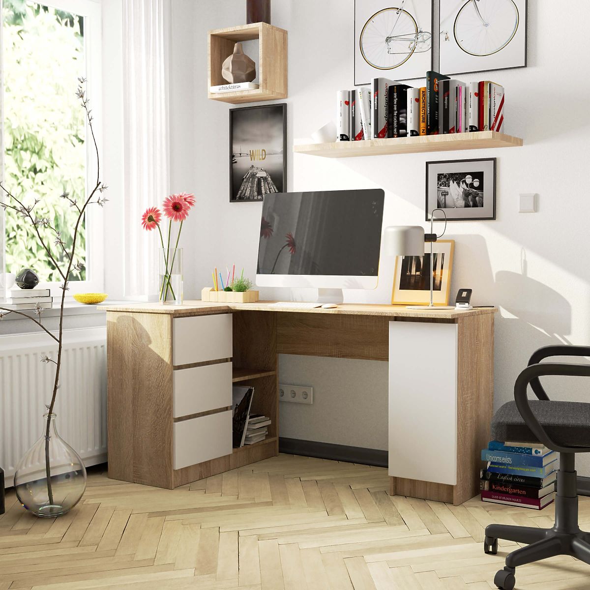 Kutni računalni stol s ladicama i ormarićem u hrastu sonoma i bijeloj boji. .. više