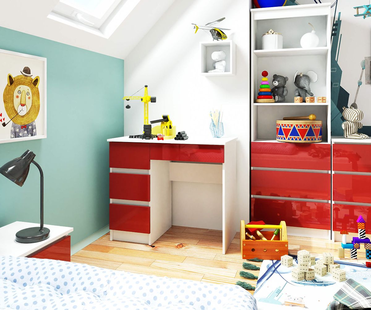 Neobična boja stola privlači pažnju, a njegova funkcionalnost osigurava da će ovaj proizvod ispuniti očekivanja i najzahtjevnijih korisnika. Namještaj kombinira bijelo kućište i efektne crvene sjajne prednje površine, što stol čini izvanrednim. To je prikladan izbor za male prostore zahvaljujući kompaktnim dimenzijama konstrukcije. Računalni stol A-7 90 cm (lijevi) sastoji se od četiri ladice. Pronaći će primjenu prvenstveno u dječjim i mladenačkim sobama, ali i u moderno uređenim uredima.