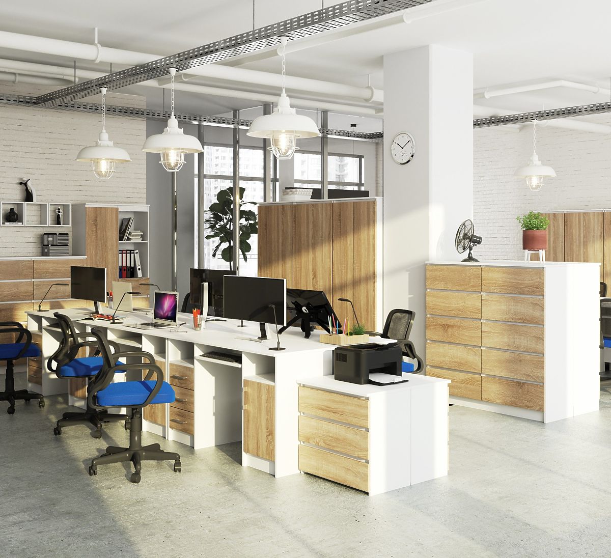 Pisaći stol ANA dizajniran je s obzirom na urede i radne sobe. Naravno, također se vrlo dobro uklapa kao studentski stol. Klasična kombinacija boja bijela i sonoma omogućuje lako prilagođavanje svakom interijeru. Velika površina ploče omogućuje nam slobodno postavljanje monitora. Tipkovnicu možemo smjestiti na izvlačnu policu ispod ploče. Stol nudi mnogo prostora za organizaciju, otvorene police, ladice i ormarić s policom. Cijela konstrukcija izrađena je od laminirane ploče otporne na habanje.