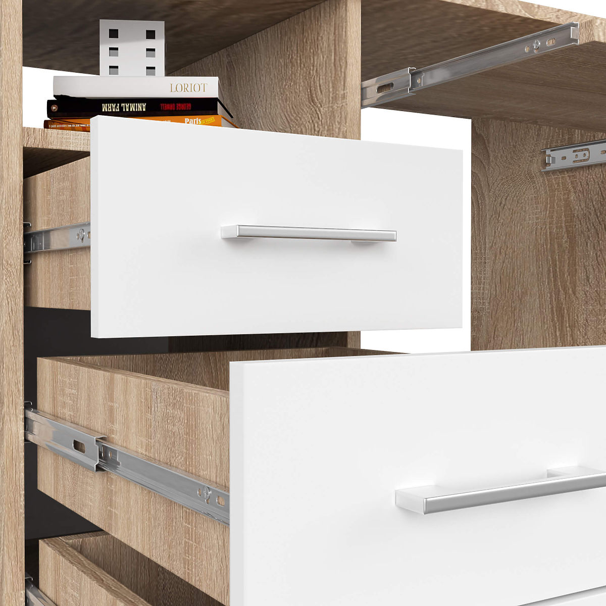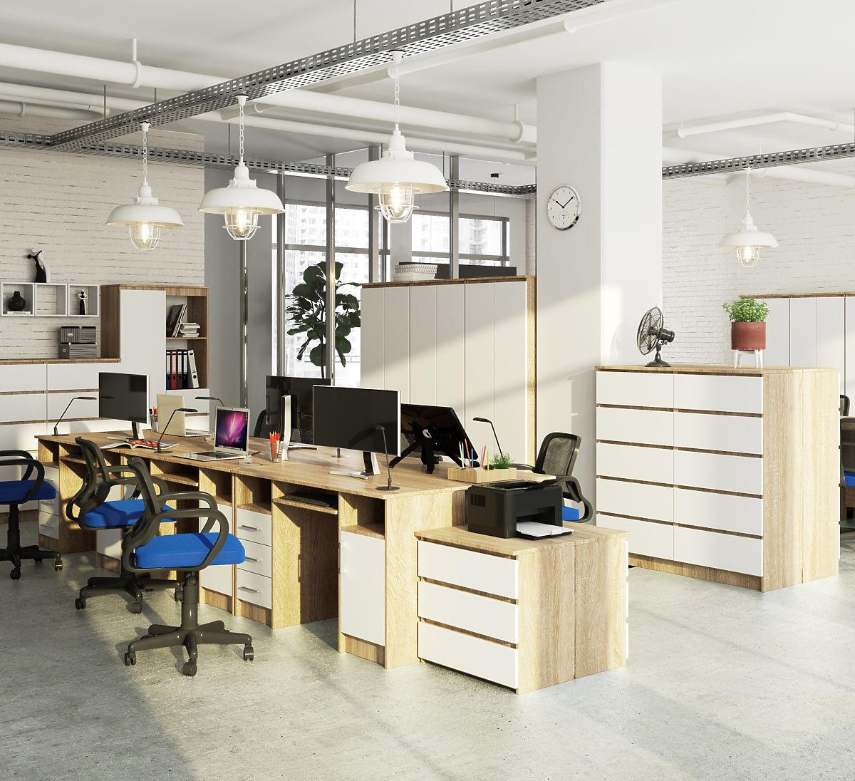 Računalni stol ANA izrađen je od laminirane namještajne ploče otporne na habanje u dvije boje. Korpus stola čini ploča s laminatom u boji hrasta sonoma, dok su fronte ladica i vrata bijele boje. Funkcionalno, namještaj je podijeljen na 3 dijela. Krajnji dijelovi čine ormariće, dok je središnji dio namijenjen za rad. Ispod ploče u središnjem dijelu nalazi se izvlačna polica za tipkovnicu, dok je u krajnjim dijelovima smještena po jedna otvorena polica. Ispod police na lijevoj strani namještaja nalaze se 3 ladice postavljene jedna iznad druge, dok je desno ormarić s preklopnim vratima koji sadrži 2 police.