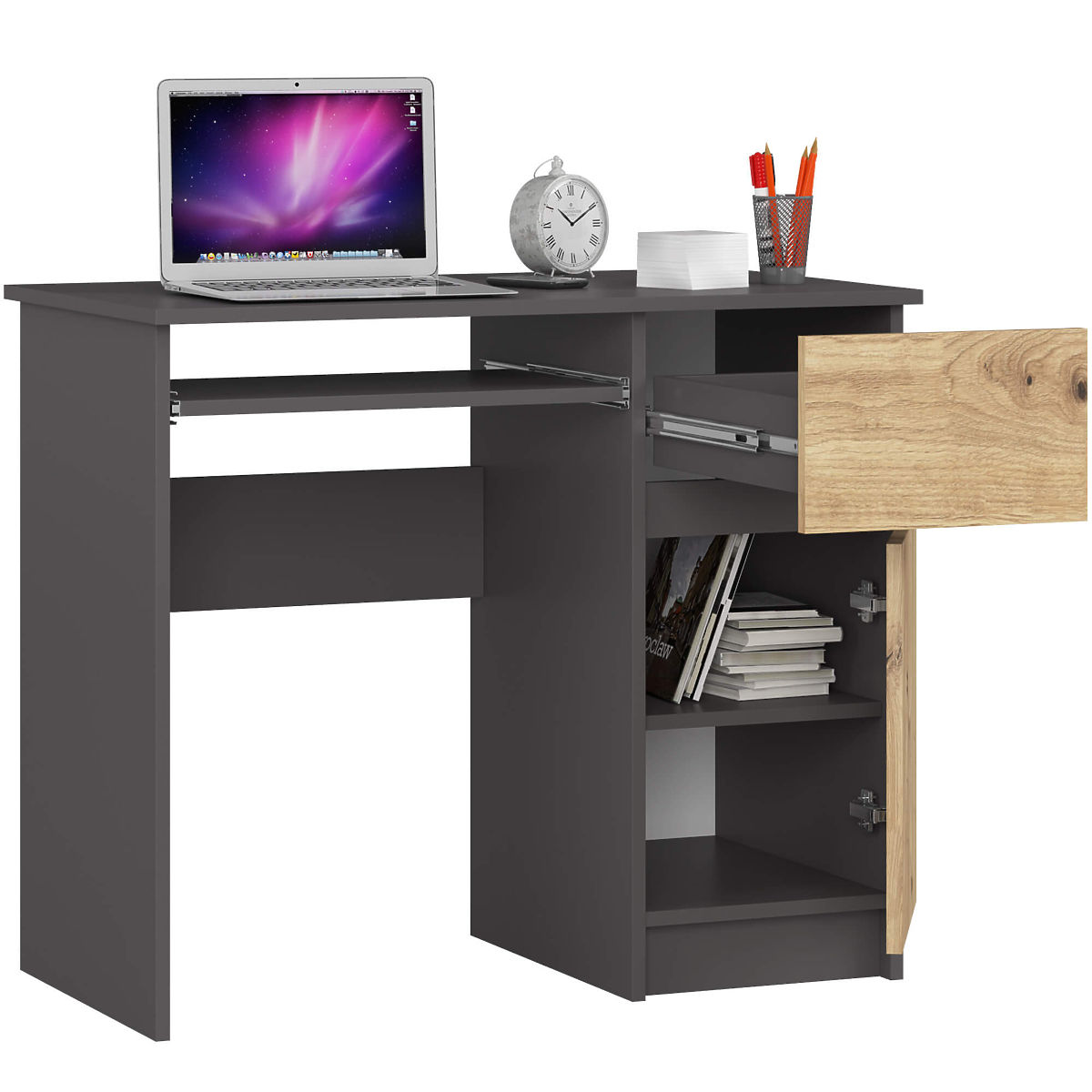 Samostojeći stol PIKSEL 90 cm u bojama GRAFIT SIVA/HRAST ARTISAN idealno je rješenje za male interijere. Vrlo dobro odgovara kao školski ili računalni stol. Njegova ergonomska konstrukcija osigurava udobnost pri korištenju. Stol je opremljen izvlačnom policom za tipkovnicu, praktičnom bočnom ladicom i ormarićem s policom u koju stanu registratori i knjige. Za izradu stola korištena je ugodna na dodir i lako održiva mat ploča prekrivena slojem laminata otpornog na habanje. Cjelinu nadopunjuju praktične ručke u srebrnoj boji.